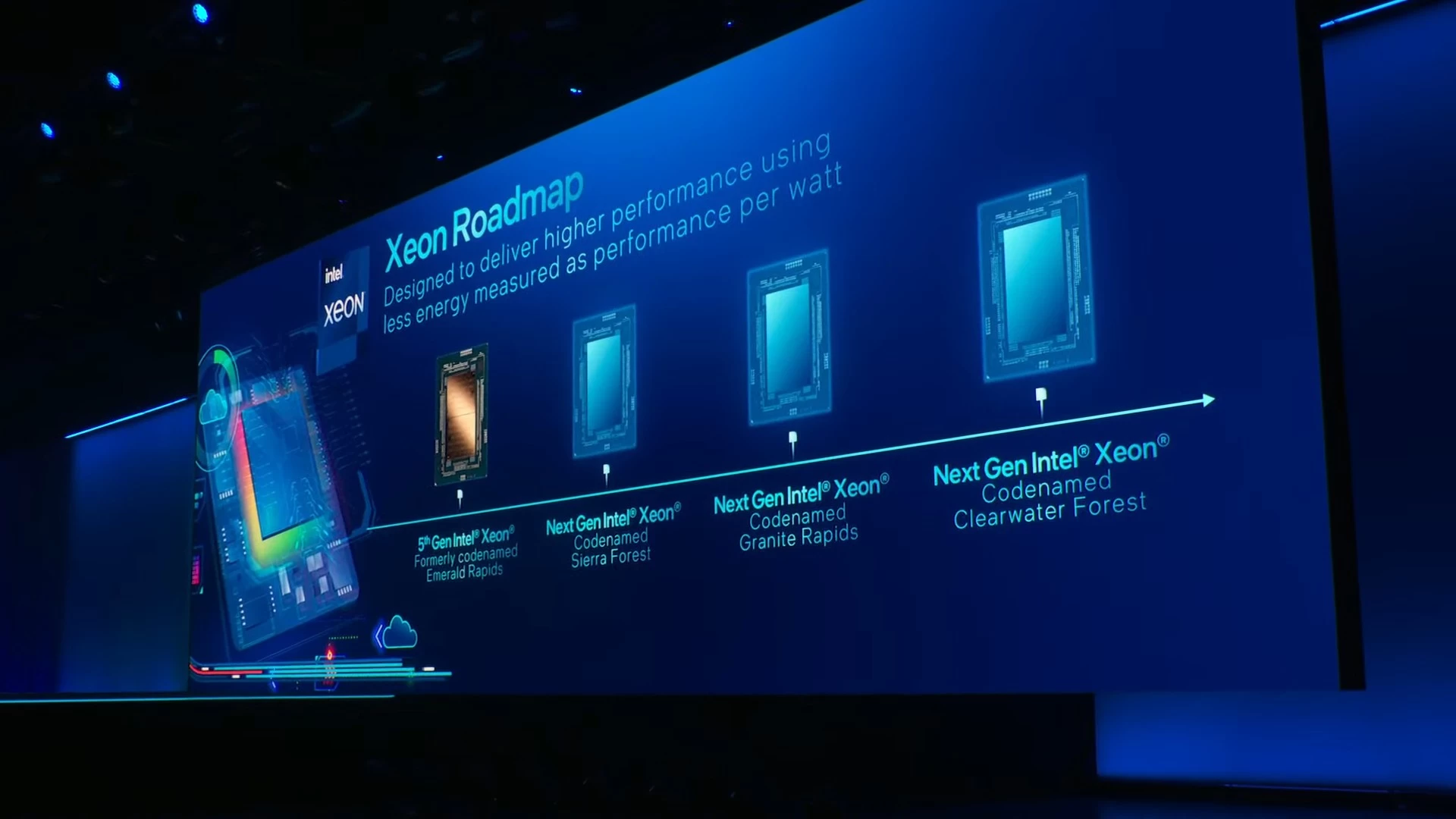 على صعيدٍ آخر، دعونا ننتقل إلى أجهزة الخوادم ومعمارية Xeon، حيث أعلنت الشركة أن معالجات Emerald Rapids المُرتقبة ستكون معنا في غضون أشهر قليلة. حيث سيتم إطلاق الجيل الجديد من شرائح Xeon في منتصف شهر ديسمبر. ولكن ما تنتظره شركة Intel بالفعل هو ترقية Xeon التي سنراها في العام المقبل 2024، والتي تحمل الاسم الرمزي Sierra Forest، التي ستجلب تصميماً بأنوية هجينة جديدة. ويبدو أن التطوير يتقدم قبل الموعد المحدد.