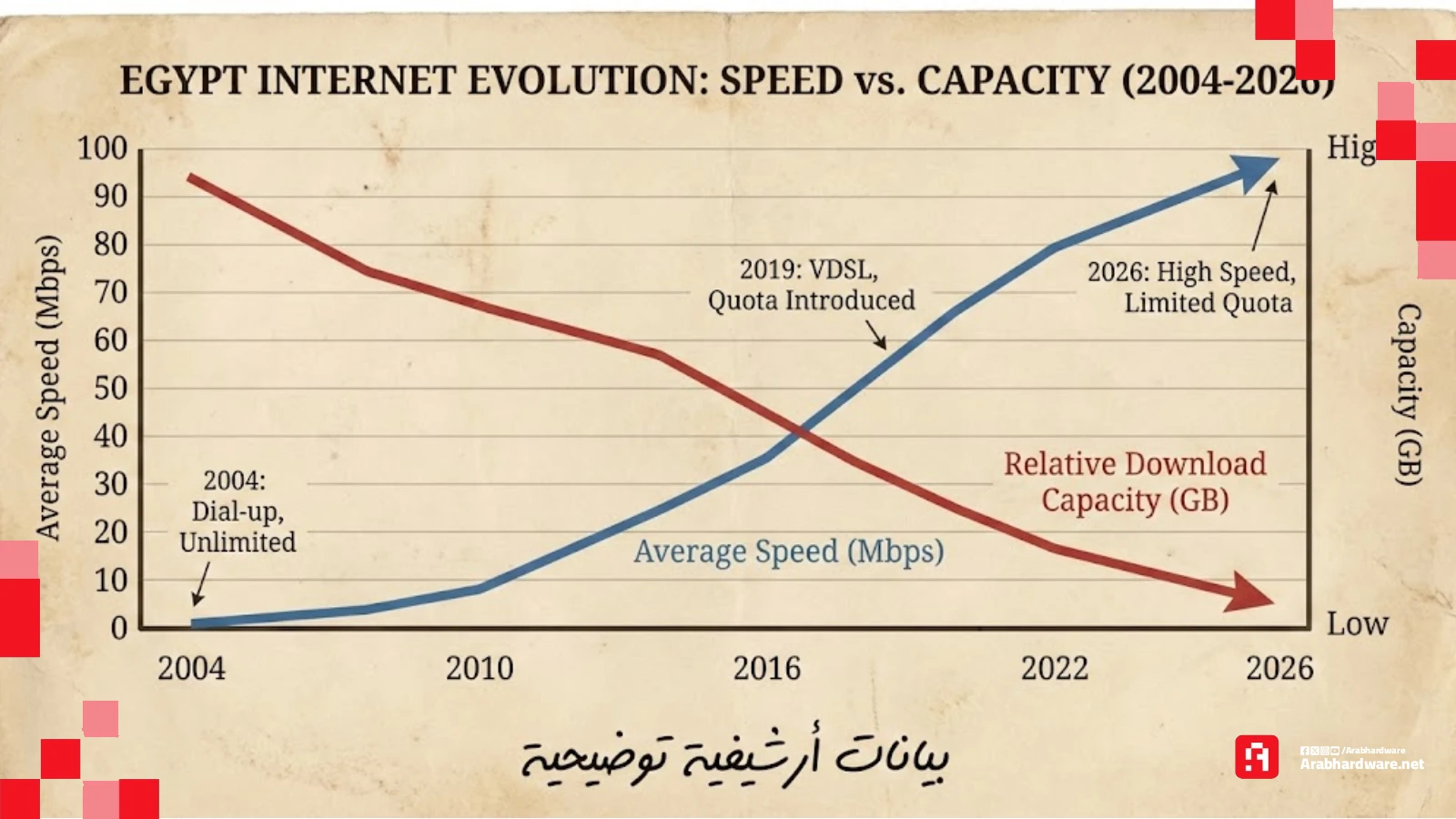 بحسب تقارير التتبع التاريخي لقطاع الاتصالات، كانت الفترة ما بين 2004 و2006 العصر الذهبي للـ ADSL، حيث كانت السرعات بطيئة (256 أو 512 كيلوبت) لكنها كانت مفتوحة. كنت تستطيع التحميل ليلاً ونهاراً دون أن يطاردك عداد الاستهلاك.
