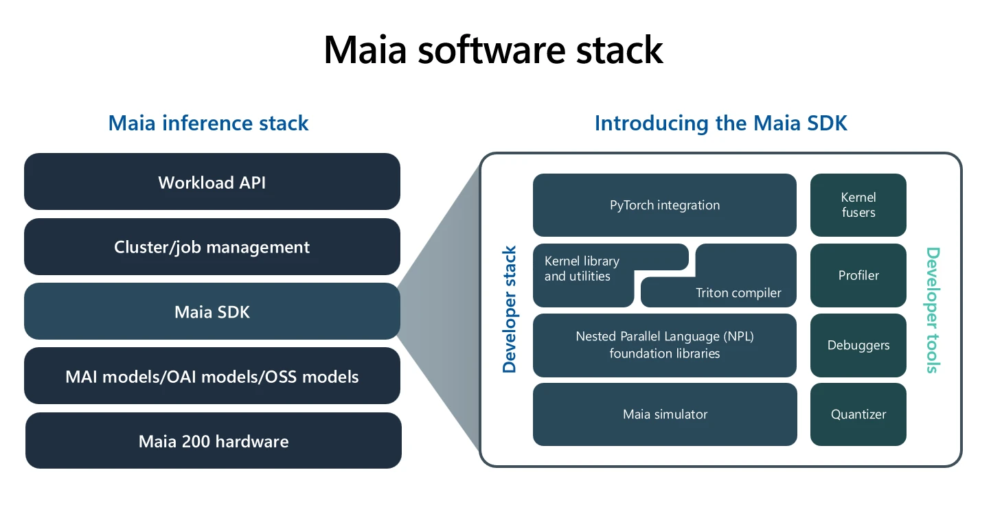 تجمع منظومة مايا 200 البرمجية بين منصة استدلال متكاملة ضمن بيئة Azure، وحزمة تطوير حديثة موجّهة للمطوّرين، صُمّمت خصيصًا لتقديم أداء مرتفع على نطاق واسع. وقد جرى تطوير هذه المنظومة بحيث تُمكّن مطوّري السحابة من اعتماد Maia بسلاسة، مع الاستفادة من الأدوات المألوفة، وفي الوقت نفسه إتاحة تحكّم منخفض المستوى عند الحاجة لتحقيق أعلى كفاءة ممكنة.