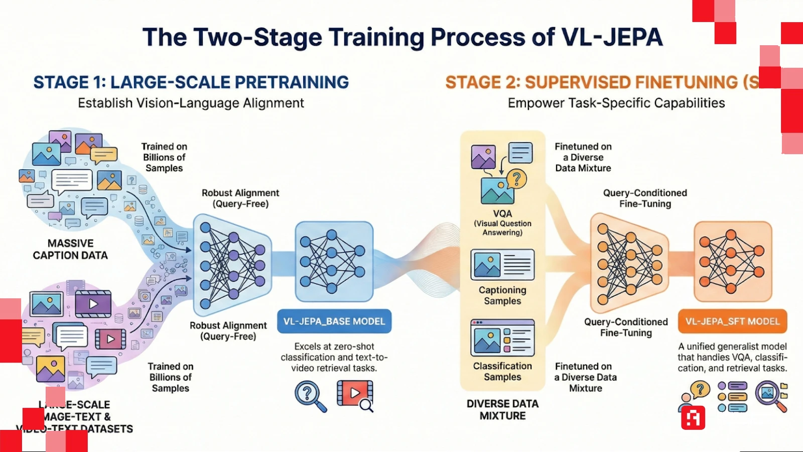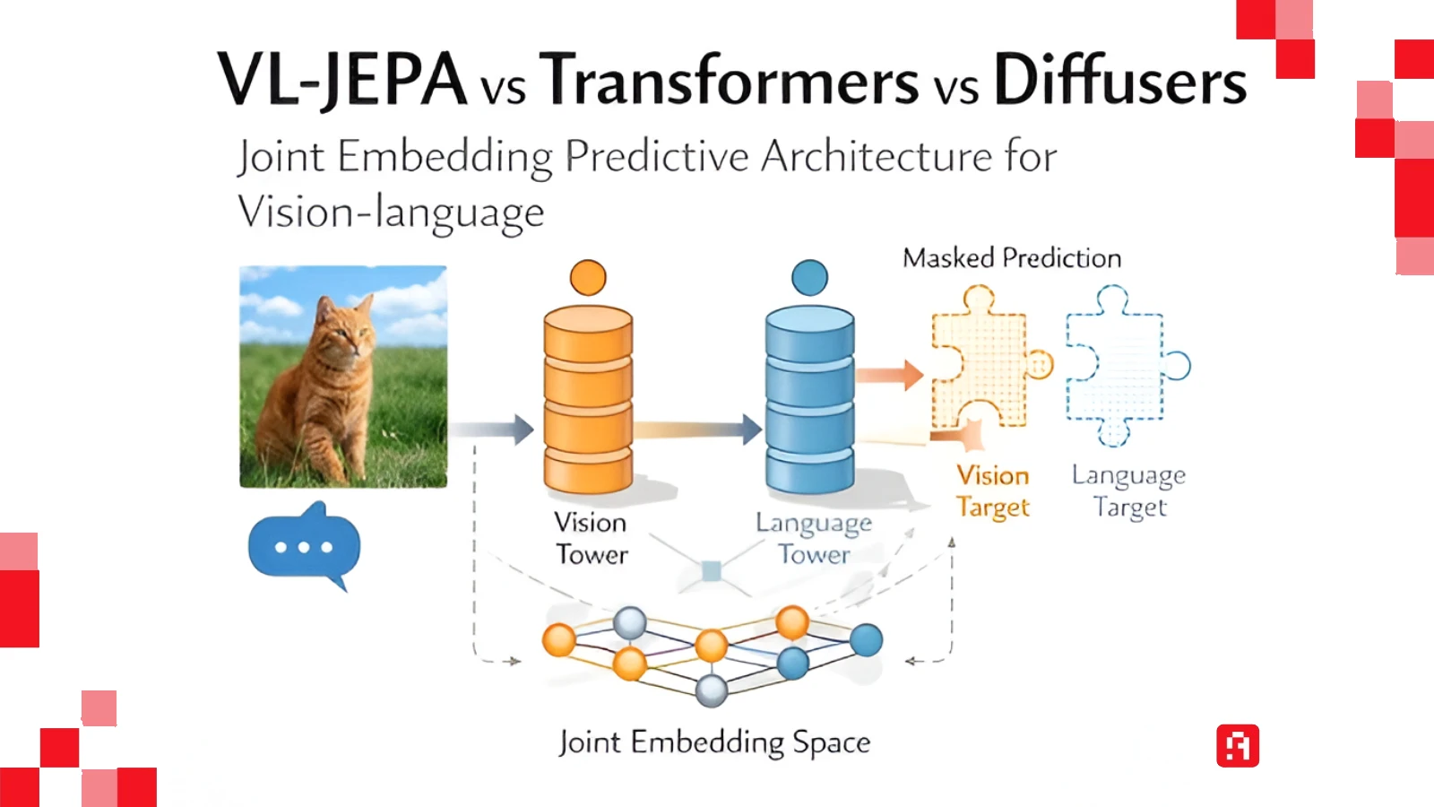 النموذج الجديد الذي طرحته ميتا، المسمى VL-JEPA (Vision-Language Joint Embedding Predictive Architecture)، ينسف الطريقة القديمة تماماً. الفكرة هنا ليست في توليد الكلمات، بل في التنبؤ بـ المعنى.