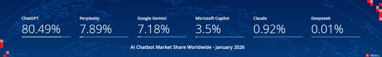 يستحوذ ChatGPT على 80.49 بالمائة من كعكة الذكاء الاصطناعي ويتبعه Perplexity بنسبة 7.89 بالمائة. ثم Gemini بنسبة 7.18 بالمائة، ليقف مساعد ميكروسوفت المدعوم بمليارات الدولارات بجوار نماذج ناشئة. أدوات مثل Claude و DeepSeek، يمتلكون حصصًا سوقية تُضاهي ما يملكه Copilot. الجمهور العريض يرفض المنتج حتى وهو متاح مجانا ومدمج في متصفح Edge بقوة.