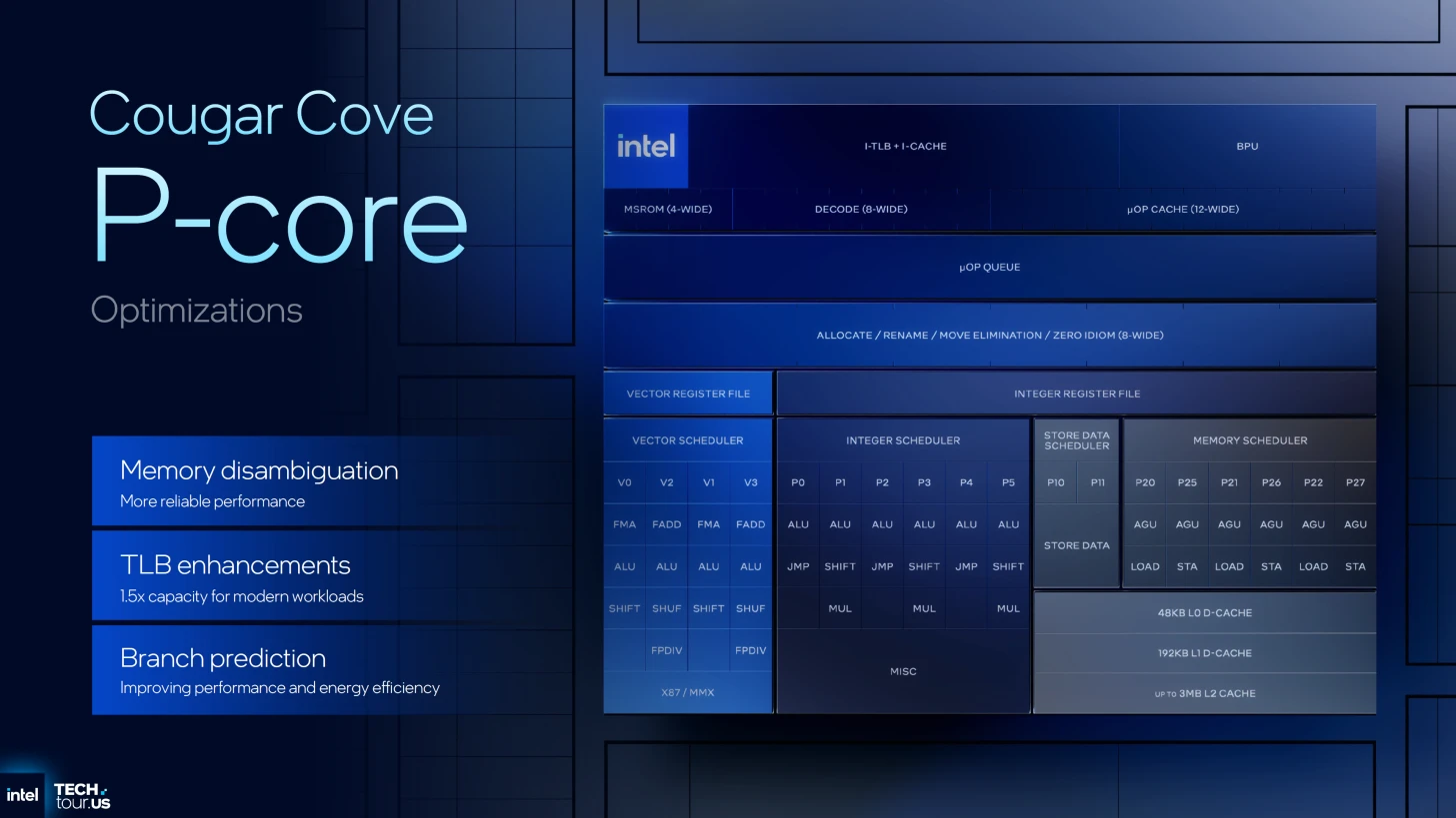 ننتقل الآن إلى تحليل أعمق للتحسينات الجوهرية داخل نواة Cougar Cove، حيث ركزت إنتل على معالجة الاختناقات الزمنية وتحسين دقة التوقعات، مستفيدة من قفزة كثافة الترانزستورات التي وفرتها عقدة التصنيع 18A. والتي يُمكن تفنيدها في النقاط التالية: