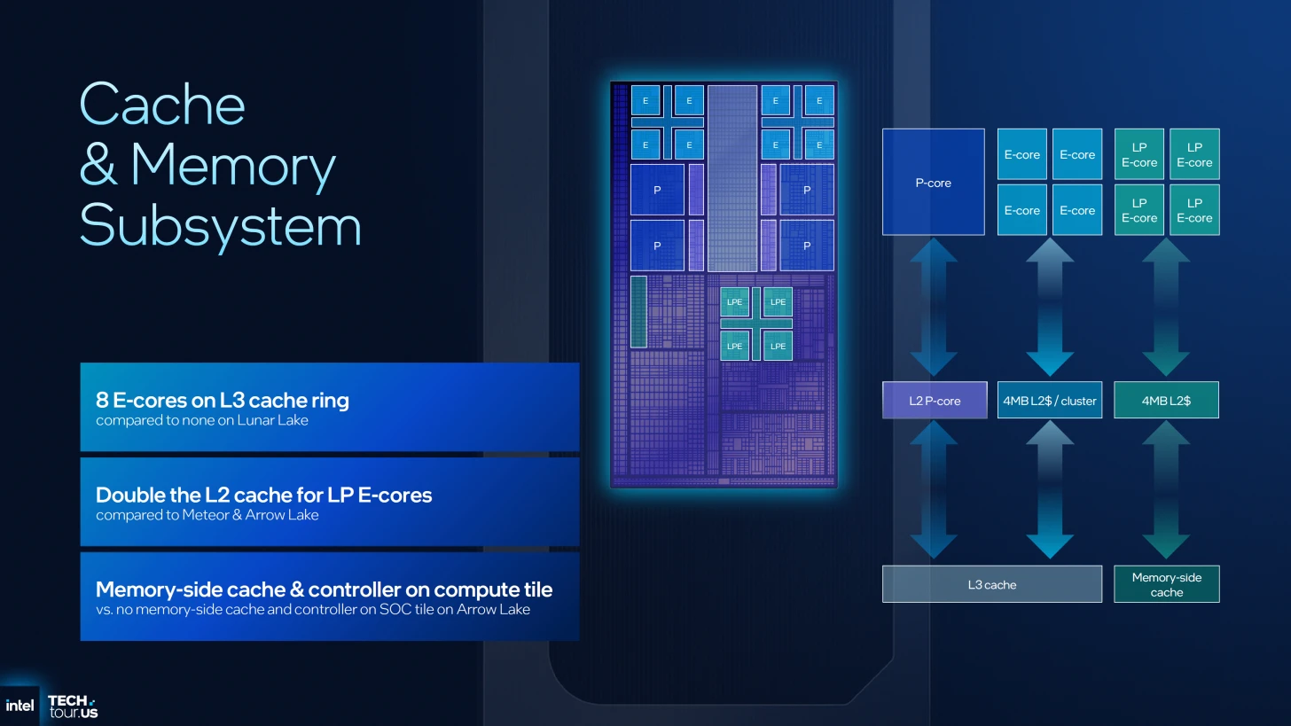 في تحول استراتيجي، قامت إنتل بنقل أنوية الكفاءة منخفضة الطاقة (LPE-Cores) لتصبح داخل البلاطة الحوسبية (Compute Tile) مباشرة، مع مضاعفة الذاكرة المخبئية للمستوى الثاني الخاصة بها لتصل إلى 4MB.