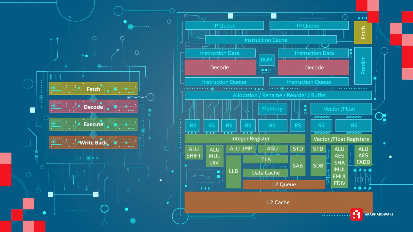 تعد هذه الكتلة هي الحلقة المحورية التي تربط الواجهة الأمامية بالخلفية، وتعمل بعرض 8 تعليمات في الدورة الواحدة، وتتكون من عدة تقنيات ذكية:
