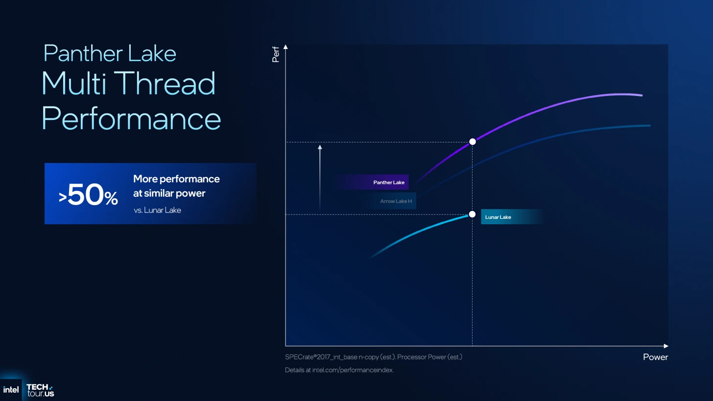 وفقًا للبيانات الصادرة عن إنتل، تعكس بنية Panther Lake قفزة نوعية في مؤشرات الأداء والكفاءة، مدفوعةً بالتحسينات المعمارية لـ 'أنوية الكفاءة' والاستفادة القصوى من عقدة التصنيع 18A.