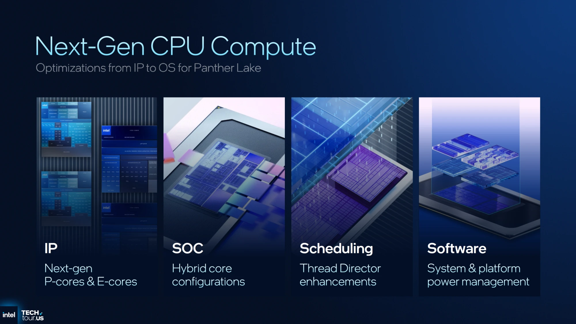 تُمثل معمارية Panther Lake القفزة التالية في خارطة طريق إنتل، ليس فقط كجيل جديد، بل كإعادة صياغة شاملة لكيفية توزيع الأحمال داخل المعالج. التركيز الأكبر في هذه المعمارية ينصب على بلاطة الحوسبة (Compute Tile) الجديدة كليًا، التي تحتضن أحدث ما توصلت إليه مختبرات إنتل، والمُتمثّلة في أنوية الأداء Cougar Cove وأنوية الكفاءة Darkmont.