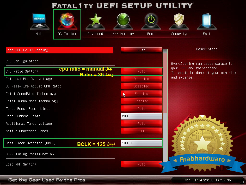 وتنوية هام : بعد تعديل قيمة BCLK وتردد الرامات يجب حفظ الاعدادات واعاده التشغيل .. ثم بعد ذلك تقم بالدخول الى البيوس ثانيه وتقم بتغيير باقى اعدادات الكسر والتى مثل اعدادات كسر باقى المعالجات ( كما قلنا تلك الخطوة من أجل كسر سرعة المعالج i7 3820 فقط )