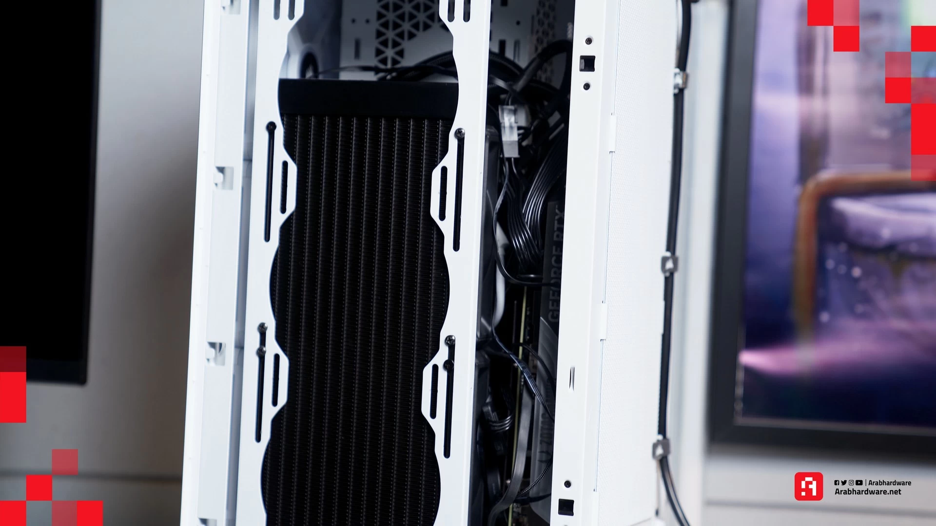 التبريد المائي في هذه الكيس مُمكن بشكلٍ كامل، حيث ستوفر لك الكيس دعم العديد من مبردات AIO بما في ذلك القدرة على تركيب مبردات بحجم 360 ملم على الجانب، و 240 ملم في الخلف (في حال ركّبت كارت شاشة بفتحة واحدة).
