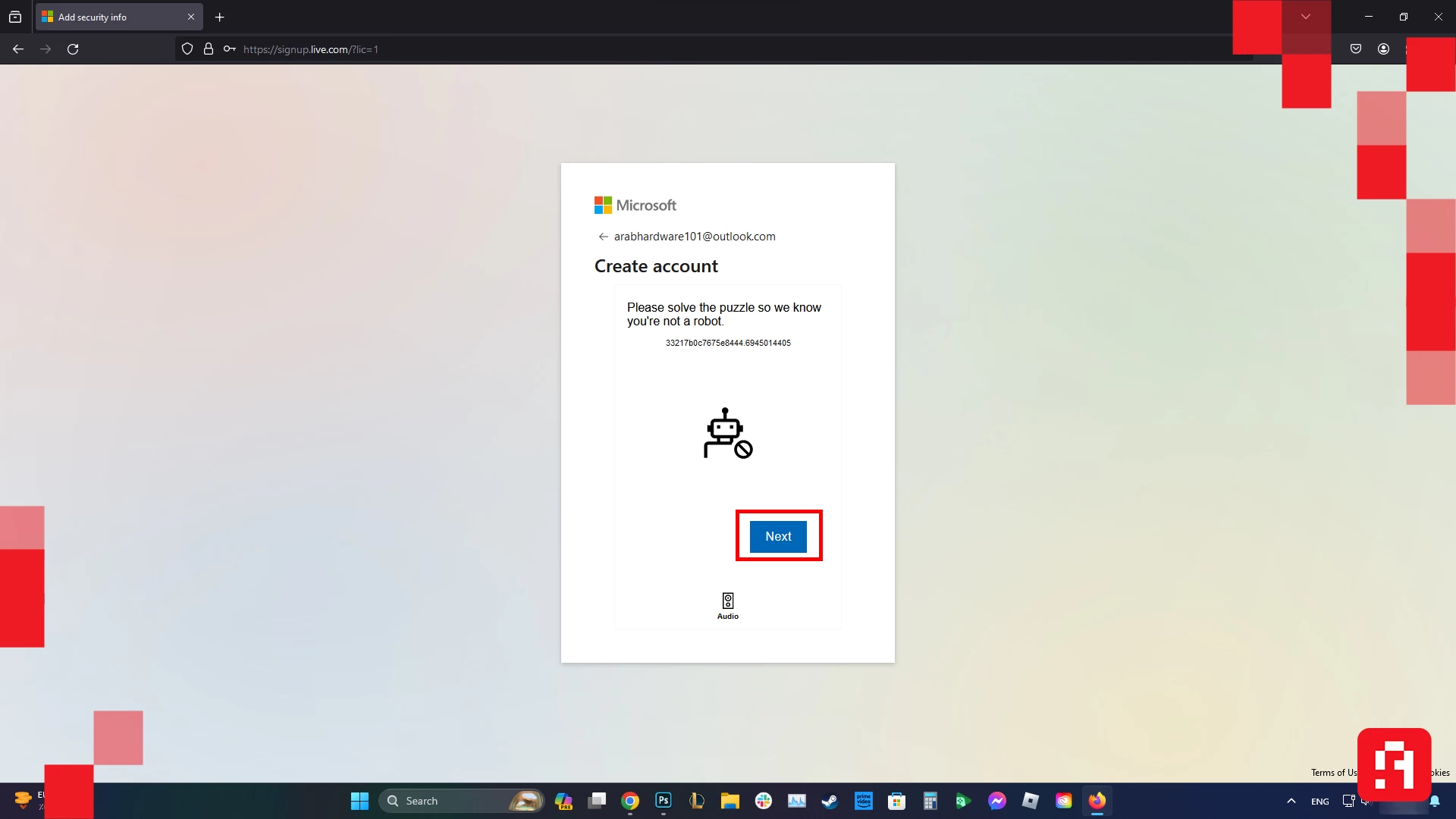 تستخدم ميكروسوفت اختبارًا غريبًا لاستبعاد أي روبوتات برمجية تُستخدم لإنشاء الحسابات الزائفة. اضغط Next لبدء الاختبار: