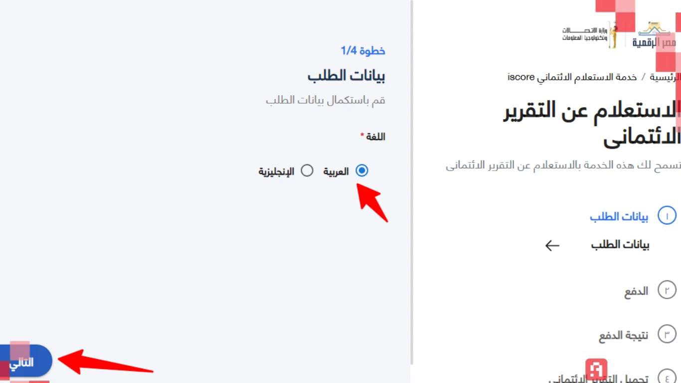 حدد اللغة التي ترغب استكمال الطلب بها، ثم اضغط على التالي.