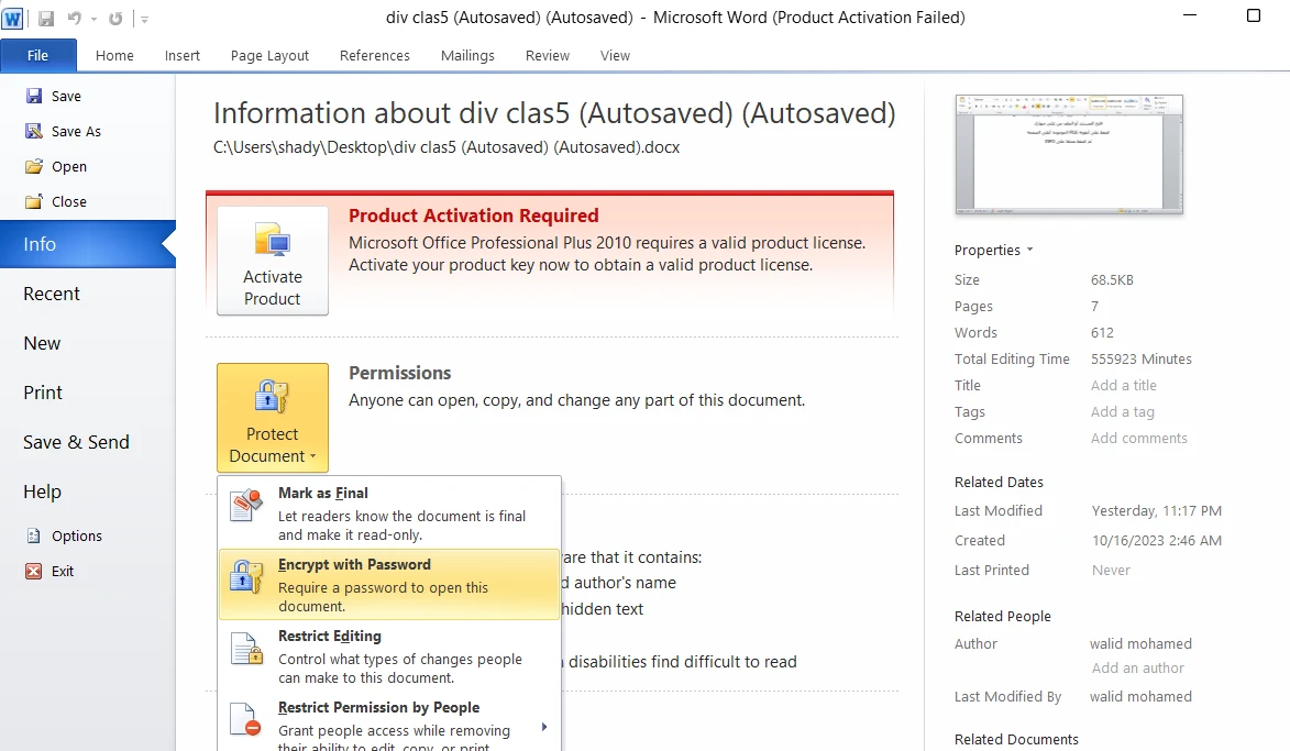 - اختر حماية المستند (Protect Document).
