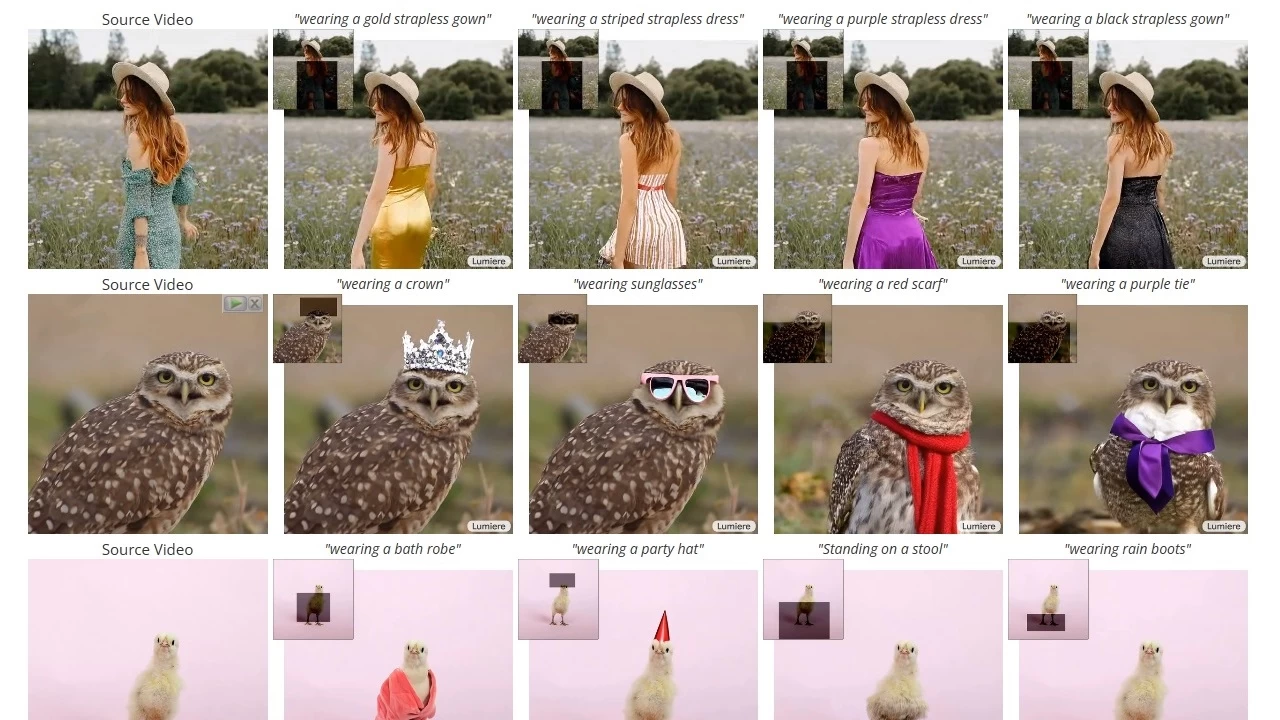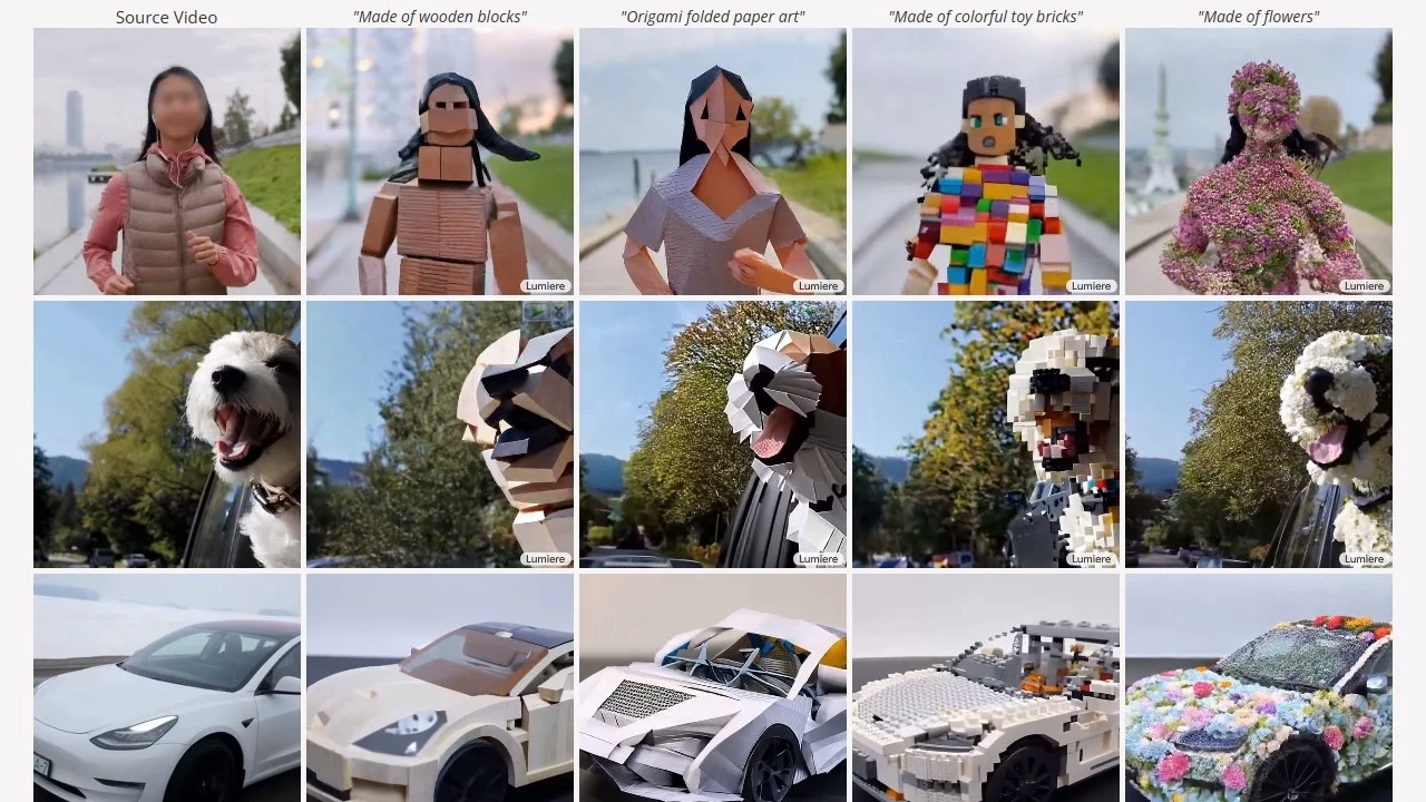 ويتمكن لوميير أيضًا من التعديل الفيديوهات، إذ أظهرت جوجل قدراته على تغيير الملابس التي يرتديها الأشخاص داخل الفيديوهات على سبيل المثال، كما كشفت عن إمكانية تحويل المقاطع الواقعية إلى مقاطع كارتونية، أو مرسومة بنمط بعض الألعاب الشهيرة من الليغو أو ماينكرافت!