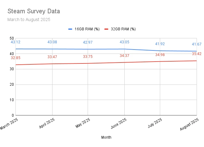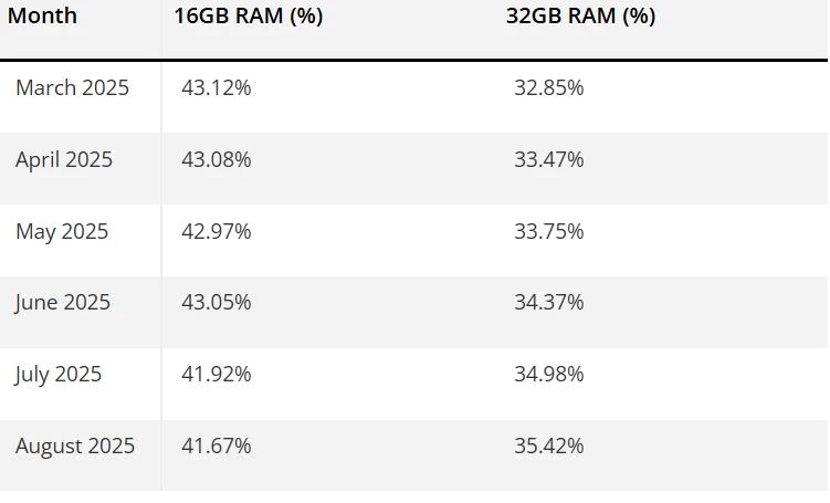 تُشير أحدث بيانات استطلاع Steam، لشهر أغسطس 2025، إلى أن أجهزة الألعاب المزودة بـ 32 جيجابايت من الرام باتت قريبةً من التفوق على الأجهزة المزودة بـ 16 جيجابايت، لتصبح بذلك التكوين الأكثر انتشارًا بين اللاعبين.