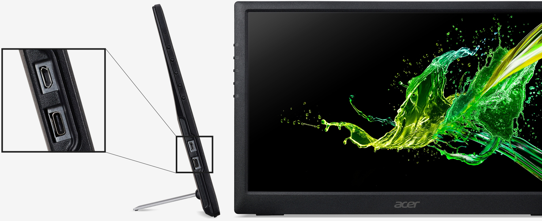 شاشة Acer PM1 كما غيرها من الشاشات التي أطلقت في الأسواق تعتمد على موصل USB 3.1 Type-C، الذي يسمح بتركيب كابل واحد لينقل بنفس الوقت البيانات والطاقة. هذا يجعل منها سهلة الاستخدام مع الأجهزة المحمولة العصرية، التي تمتلك منافذ USB-C. في غضون ذلك, تمتاز الشاشة أيضاً بمنفذ طاقة micro-USB ثانوي لإمداد الطاقة على الشاشة عند وصلها بهاتف ذكي، أو جهاز آخر منخفض الطاقة الذي لايمكن أن يشغل الشاشة بنفسه.