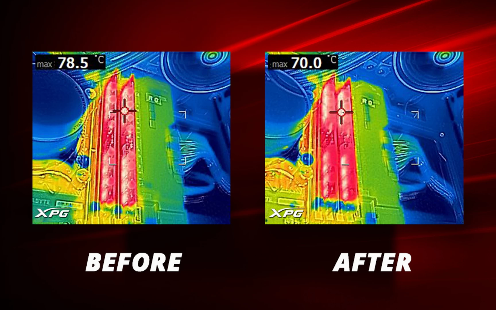 تؤثر درجات الحرارة المرتفعة الناتجة عن كسر سرعة الرامات على استقرار النظام وأدائه وموثوقيته. لذلك، تتصدر XPG الصناعة في تطبيق تقنية الطلاء الحراري للوحات المطبوعة أو الـPCB الخاص بالرامات مكسورة السرعة، مما يقلل درجات الحرارة بشكل فعال لأكثر من 10%. وسيتم طرح تقنية الطلاء الحراري للـPCB الجديدة هذه في الربع الثاني وحدات الـDDR5 بسرعات تبلغ 8000MT/s أو أكثر.