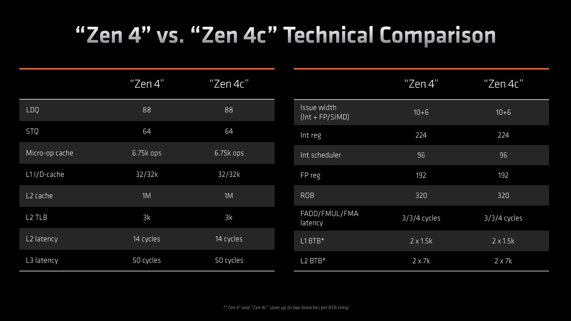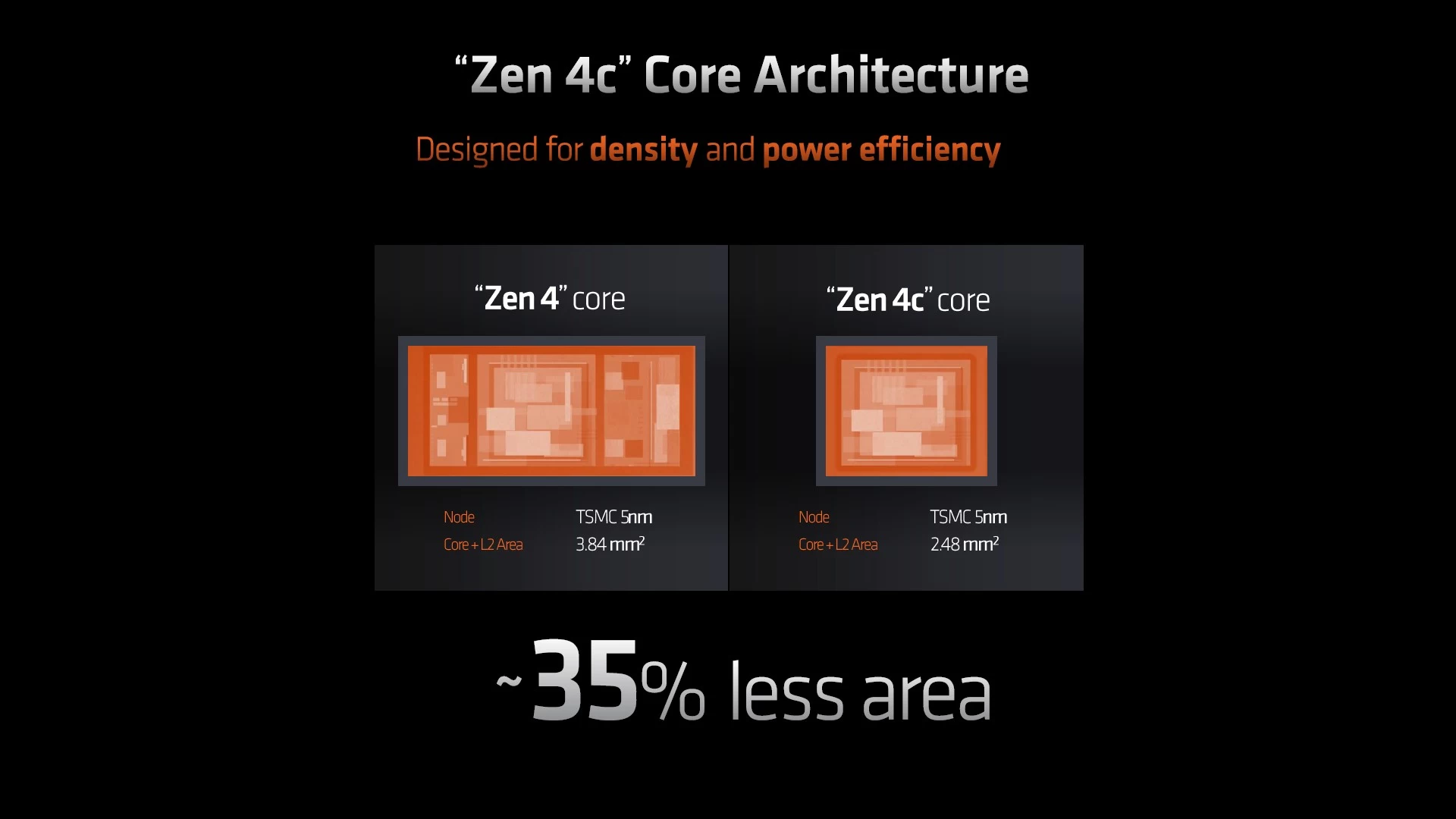 لعل السبب الرئيسي في كون أنوية Zen 4c الجديدة تأتي مماثلة تقريباً لما تُقدّمه Zen 4 هو أن التصميم الأساسي للأنوية هنا تقريباً واحد، مع تحسين أنوية Zen 4 لتوفير أداء أفضل مع الترددات الأعلى واستهلاك الطاقة فوق 20 واط، في حين تأتي أنوية Zen 4c مُحسّنة بشكل أكبر لتوفير الطاقة والحجم الأصغر. هذ يظهر بشكل واضح أيضاً عند مقارنة معالج Ryzen 7540U ونظيره Ryzen 7545U الذي يأتي مع أنوية Zen 4c ليوفّر نفس الاداء ولكن مع استهلاك طاقة أقل بفضل تكوينه الذي يضم نواتين Zen 4 مع أربعة من أنوية Zen 4c.
