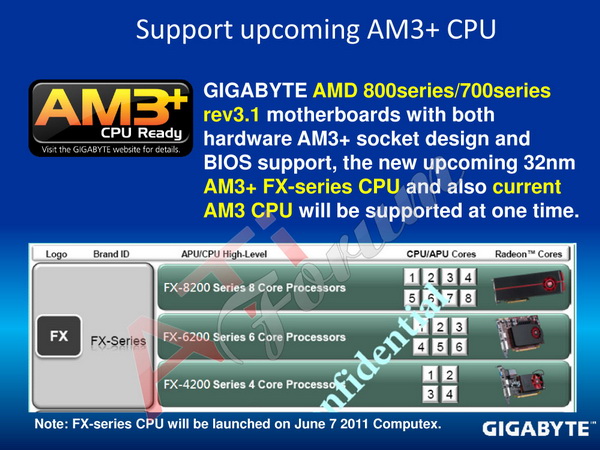 طبقاً لشريحة مسرّبة من شركة Gigabyte كشفها أحد المواقع الألمانية فإن معالجات البلدوزر القادمة سيبدأ إطلاقها بعد معرض انتهاء معرض Computex بأيام .