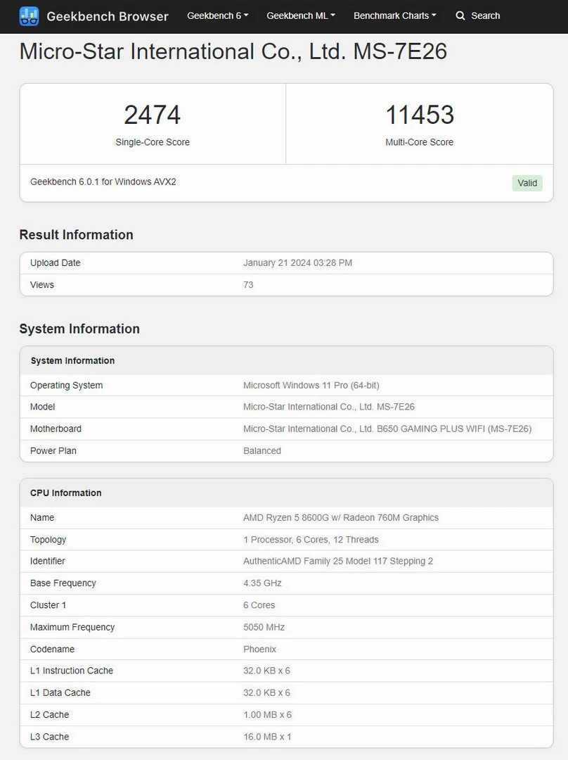 في المقابل، ظهرت نهاية الأسبوع الماضي أرقام مسربة لمعالج الفئة المتوسطة Ryzen 5 8600G (الذي يأتي مع حل رسومي Radeon 760M)، مقترناً باللوحة الأم MSI B650 GAMING PLUS WIFI (MS-7E26) ورامات DDR5 بسعة 32 جيجابايت (6400 MT/s)؛ وسجل المعالج نتيجة 2474 في نتيجة الاختبار أحادي النواة، و11453 في النتيجة متعددة الأنوية.