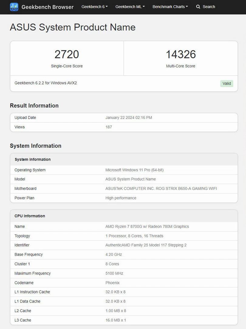 بالنسبة لمنصة الاختبار، فقد تم وضع معالج Ryzen 7 8700G (الذي يأتي مع حل رسومي Radeon 780M) على لوحة أم ASUS ROG STRIX B650-A GAMING WIFI مع 32 جيجابايت (6398 MT/s) من رامات DDR5، وقد سجل المعالج نتيجة 2720 في نتيجة الاختبار أحادي الأنوية، و14326 في النتيجة المتعددة الأنوية.