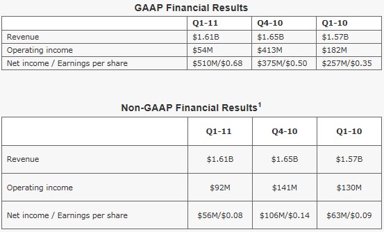 ومقارنةً بالربع الأول Q1 من عام 2010 السابق فهناك ارتفاع ملحوظ خصوصاً في صافي الأرباح حيث كان صافي الأرباح وقتها 257 مليون دولار فقط مع عائدات وصلت إلى 1.57 مليار دولار
