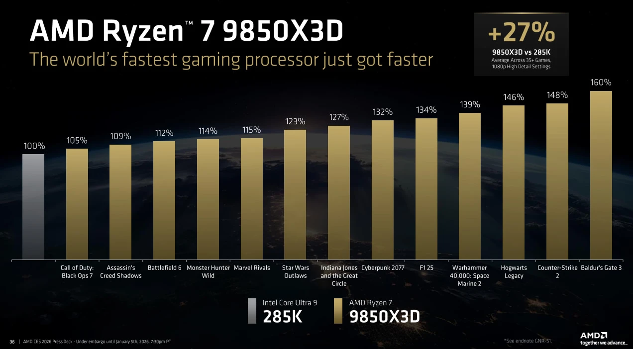 من خلال مجموعة مختارة من الاختبارات على مجموعة من الألعاب - هذه النتائج من مختبرات AMD - التي تضم أكثر من 35 لعبة بدقة 1080p على إعدادات مرتفعة، تزعم AMD أن معالج الألعاب الجديد Ryzen 7 9850X3D أسرع بنسبة 27% في معدل الفريمات المتوسطة من معالج Intel Ultra 9 285K وتتراوح الزيادة بالأداء ما بين 5% و 60% اعتماداً على اللعبة المختبرة.