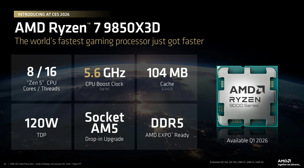 أكدت AMD رسميًا أن إطلاق المعالج المركزي الجديد Ryzen 7 9850X3D في الأسواق العالمية سيكون في يوم 29 من يناير مع صدور المراجعات الرسمية لهذا المعالج في يوم 28 من يناير.
