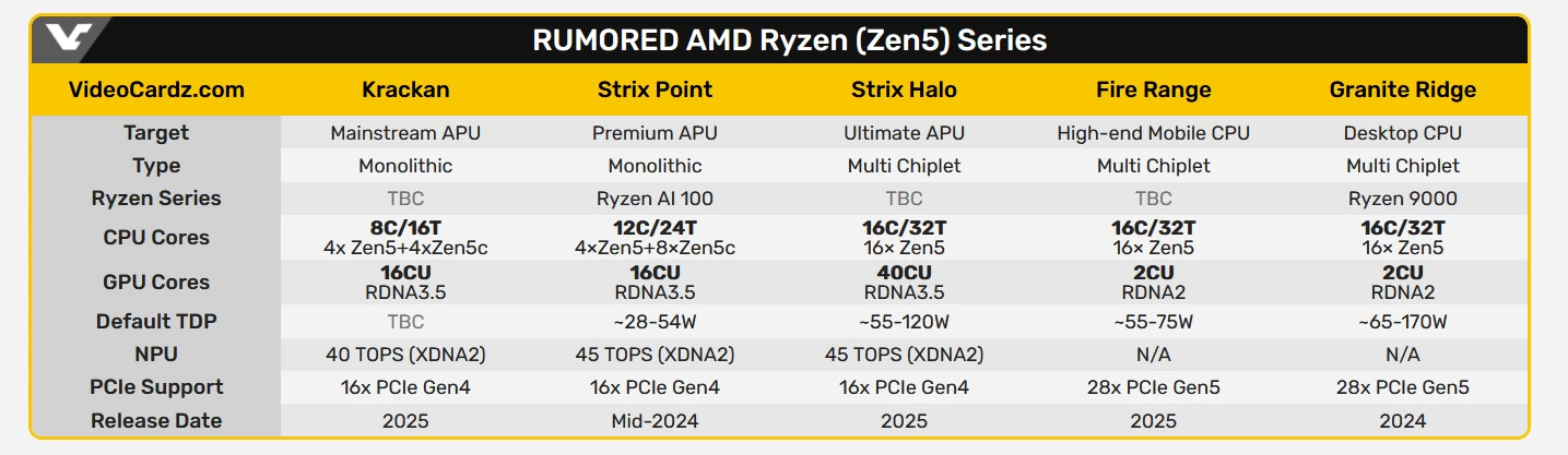 بالطبع لا تزال هناك الكثير من المعلومات التي لا نعرفها عن معمارية Zen 5 ولا حتى عن فئات المعالجات الأُخرى التي ستأتي بهذه المعمارية. ولكن الأمر المعروف لنا حتى الآن هو أن سلسلتي Strix Point و Kraken ستكونان موجّهتان لفئة أجهزة اللاب توب. في حين أن معالجات Strix Halo ستكون الفئة الأعلى من حيث الأداء واستهلاك الطاقة في الجيل الجديد من المُعالجات، ولكنها ستُقدّم مستويات أداء مماثلة لكروت الشاشة المنفصلة.