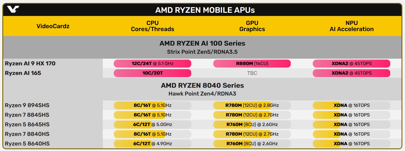 المعالجات الجديدة ستأتي ضمن سلسلة تُدعى Ryzen AI 100، والتي منها معالج Ryzen AI 9 HX 170 الذي سيأتي مع 12 نواة إجمالاً، أربعة منها من فئة Zen5 وثمانية من فئة Zen5c الموفّرة للطاقة.
