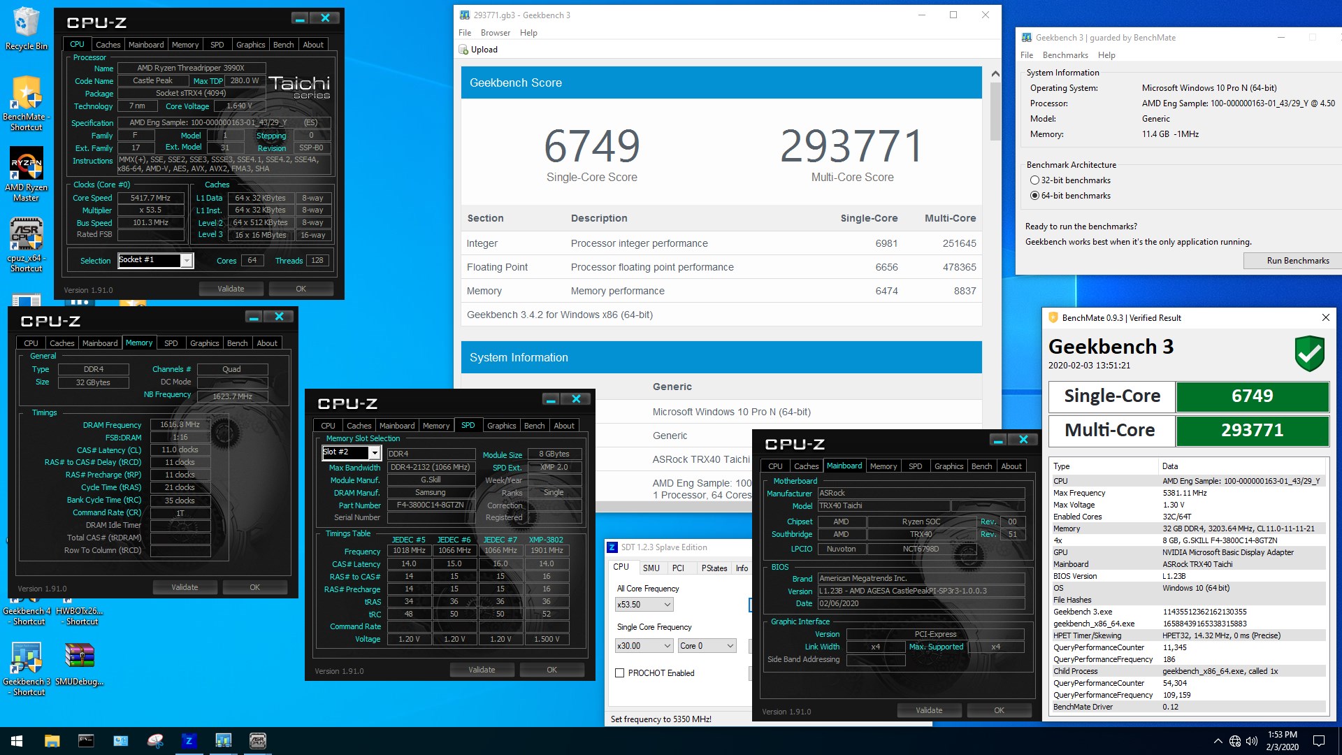 اما مع بينشمارك GPUPI فلقد حقق النتيجة بوقت 21 ثانية و 622 جزء من الثانية على نفس المعالج ولكن بتردد 5475.4MHz. وأخيراً مع بينشمارك GEEKBENCH3 حقق 293771 نقطة مع نفس المعالج ولكن بتردد 5375MHz...كل تلك النتائج استخدم معها اللوحة الأم ASRock TRX40 Taichi.