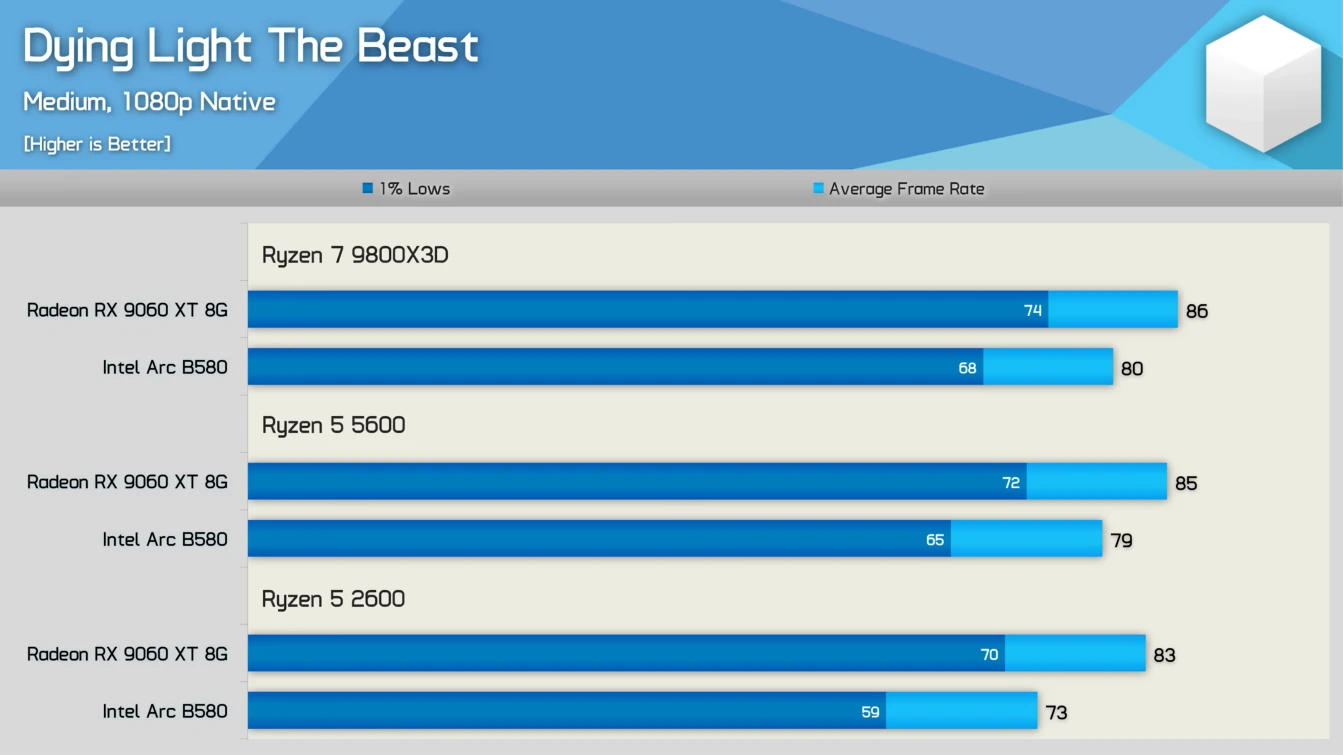 فبعد أن كانت النتائج بعيدة لصالح الـ RX 9060 XT، استطاع كارت Intel Arc B580 أن ينافسه الآن في أشهر الألعاب الحديثة مثل Marvel’s Spider-Man Remastered، وCyberpunk 2077: Phantom Liberty، وDying Light: The Beast، وغيرهم.