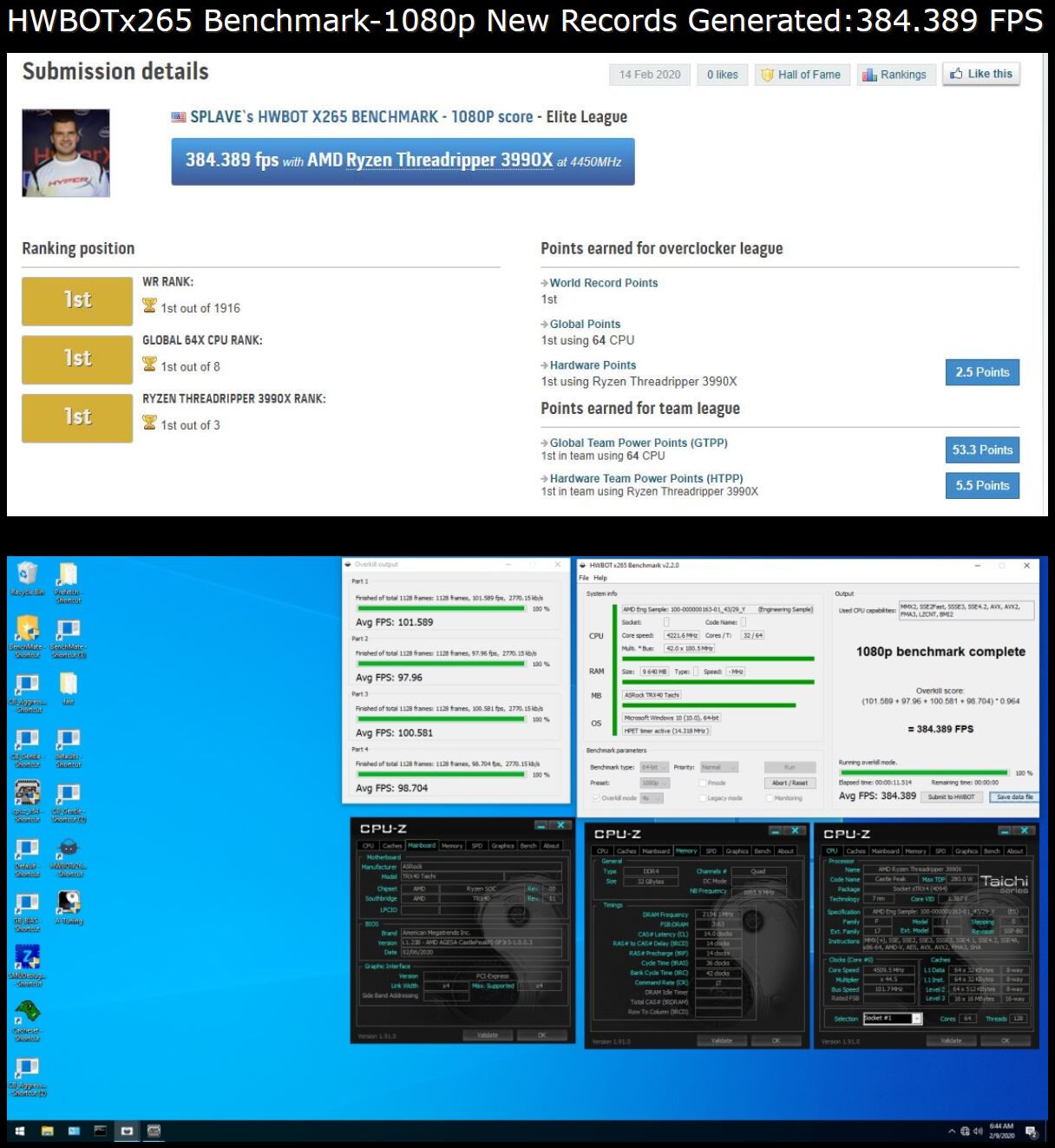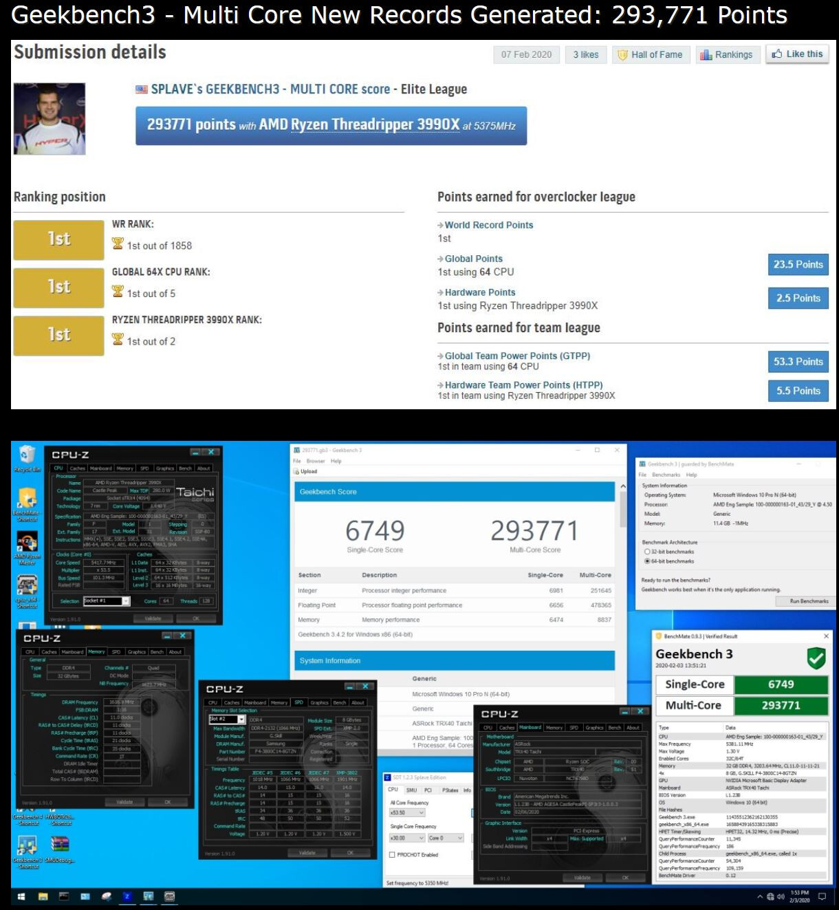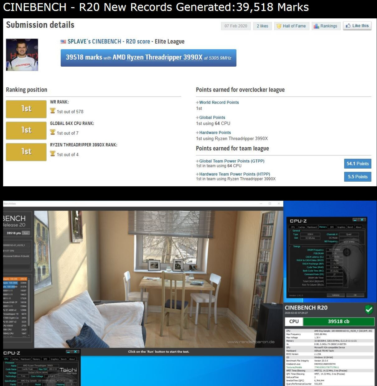 أولى الأرقام القياسية التي حققها كاسر السرعة هو الوصول بمعالج Ryzen Threadripper 3990X لتردد 5748.66MHz, كما تم تحطيم رقم عالمي مع بينشمارك GPUPI for CPU حيث حقق 21 ثانية و 622 جزء من الثانية, بينما مع بينشمارك CINEBNCH R20 فلقد حقق رقم عالمي وهو 39518 ألف نقطة, كذلك مع بينشمارك Geekbench3 الذي حقق في اختبار تعدد الانوية رقم قياسي بنتيجة 293771 ألف نقطة. اما بينشمارك HWBOTx265 على دقة 1080 بكسل فلقد حقق رقم عالمي أيضاً عند 384389 ألف نقطة.