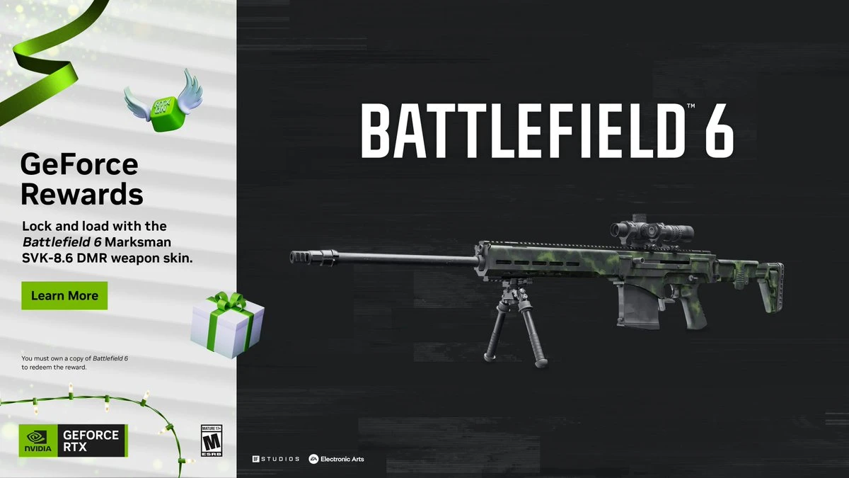 إلى جانب ذلك، انطلق موسم RTX الذي يقدم مكافآت حصرية، سحوبات، ومحتوى داخل الألعاب للاعبي GeForce RTX. سيبدأ اللاعبون موسمهم بسلاح Marksman SVK-8.6 DMR للعبة Battlefield 6، والذي يمكن الحصول عليه عبر تطبيق NVIDIA من خلال قسم "مكافآت GeForce"، فقط بالنقر على "استرداد" في الجانب الأيسر من الواجهة واتباع الخطوات حتى استلام السلاح.