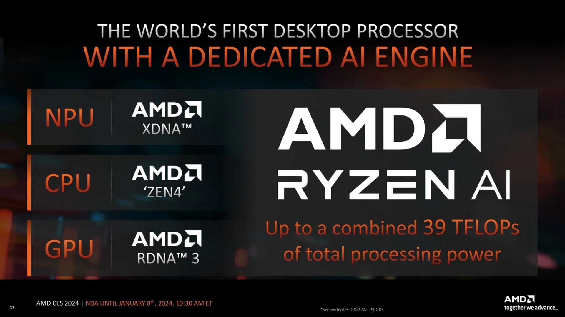 تُعدّ سلسلة AMD Ryzen 7 8000G أيضًا أول معالجات مكتبية في العالم مُزوّدة بمُحرّك AI مُخصّص (تقتصر Intel's Meteor Lake حاليًا على منتجات الأجهزة المحمولة). يتم تسجيل وحدة NPU بسرعة 1.6 جيجا هرتز، وهي أسرع بكثير من وحدات AMD NPU السابقة وعلى قدم المساواة مع سلسلة Ryzen 8040 المُخصّصة للأجهزة المحمولة، مما يوفر 39 TFLOPs من قوة المعالجة. وفيما يلي نظرة على التشكيلة الكاملة، مع المواصفات والأسعار.