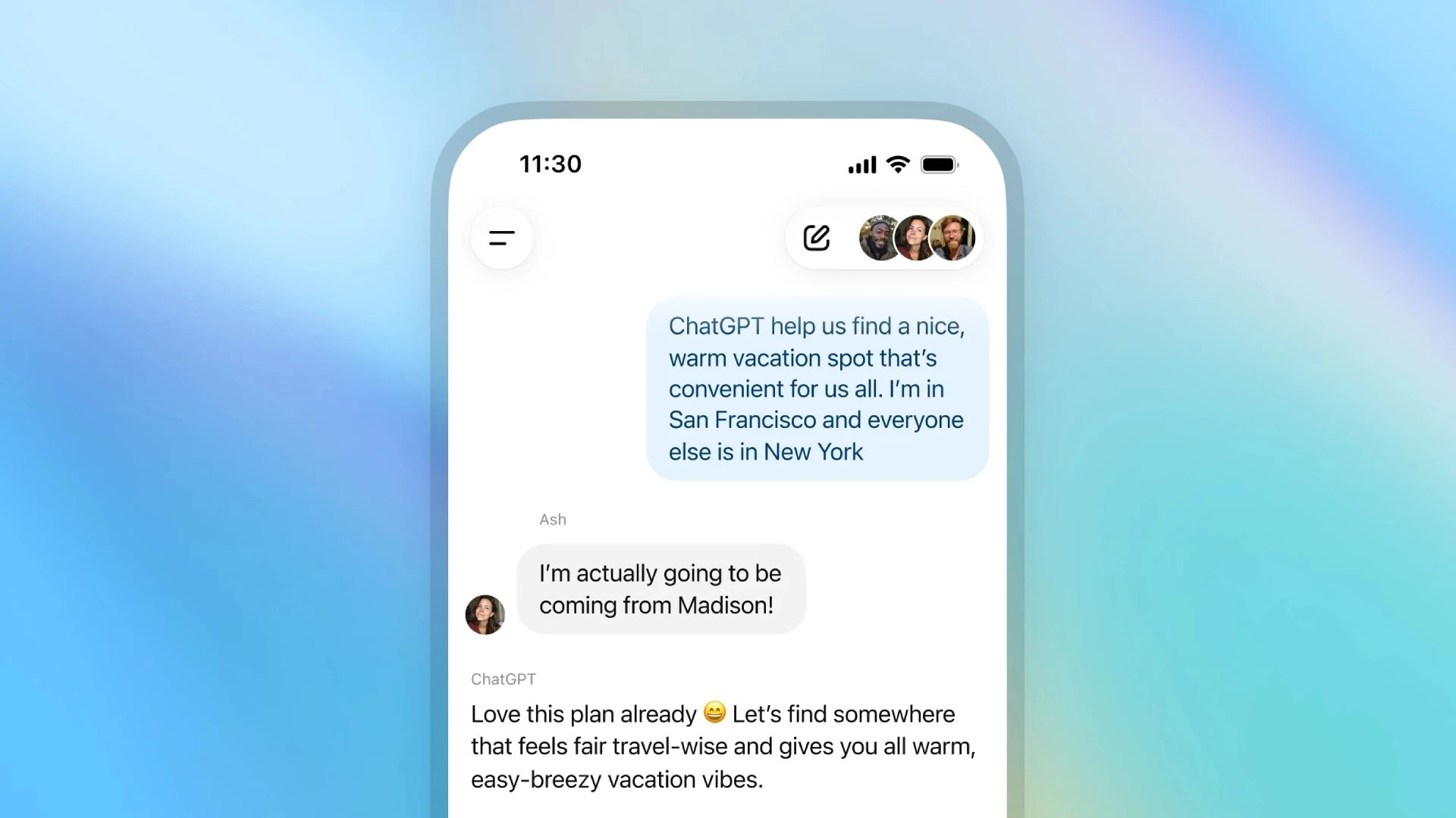 أطلقت شركة OpenAI ميزة الدردشة الجماعية في ChatGPT بشكلٍ عالمي لمُستخدمي الخطط المجانية والمدفوعة لتتحوّل التجربة من مُحادثة فردية إلى مساحة مُشتركة يمكن أن يجتمع فيها الأصدقاء أو الزملاء أو العائلة للعمل والتخطيط واتخاذ القرار مع مساعدة الذكاء الاصطناعي. لفتت الشركة الانتباه بإمكانية إضافة ما يصل إلى 20 شخصًا إلى الدردشة وإدارة خصوصيات كل مُستخدم على حدةٍ.