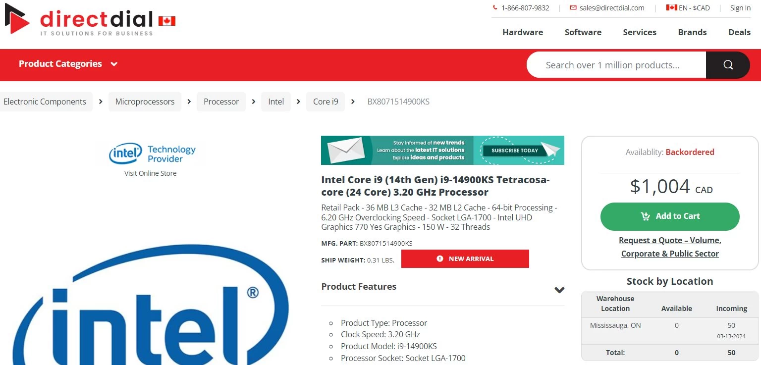 الجدير بالذكر هنا أن أحد المتاجر الكندية قام بالفعل بعرض المعالج على الموقع للطلب المُسبق، مؤكّداً المعلومات المنشورة عنه مثل كونه سيأتي بنفس حدود الطاقة TDP عند 150 واط. وسيأتي المعالج بسعر يصل إلى 1004 دولار كندي، وسيتوافر الشهر القادم.