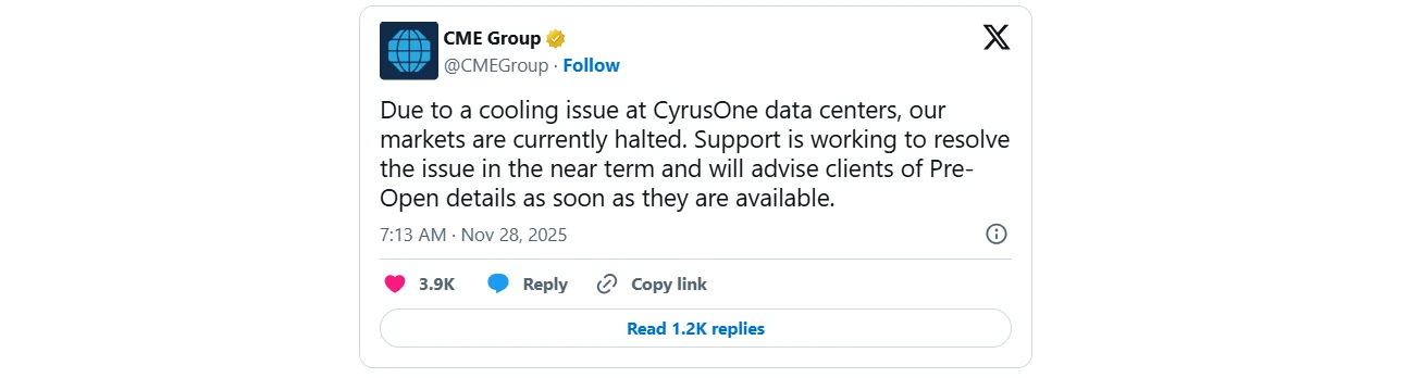 في البداية علقت بورصة شيكاغو التجارية عبر حسابها على منصة X قائلة: "بسبب مشكلة في التبريد المخصصة لمراكز بيانات CyrusOne، علقنا أسواقنا في الوقت الحالي. يعمل فريق الدعم على حل المشكلة في المدى القريب، وسنقوم بإخطار العملاء بتفاصيل ما قبل الافتتاح بمجرد الإعلان عن ذلك".