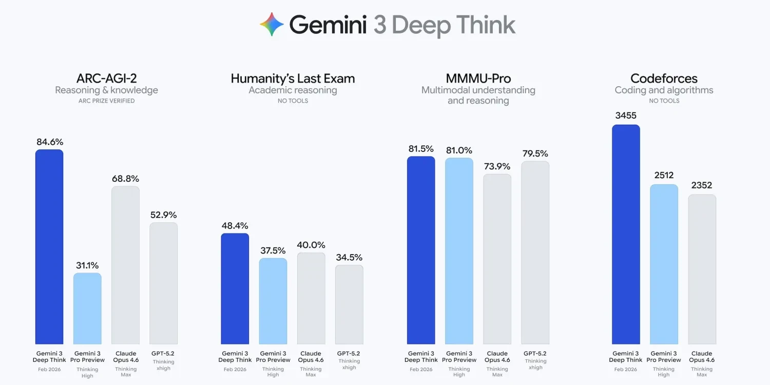 كما حقق نسبة 84.6% في اختبار ARC-AGI-2 (يقيس القدرة على الاستدلال التجريدي وحل المشكلات) بعد التحقق من مؤسسة ARC Prize، وسجل تصنيف Elo بلغ 3455 على منصة Codeforces الخاصة بتحديات البرمجة التنافسية، إضافة إلى أداء بمستوى الميدالية الذهبية في أولمبياد الرياضيات الدولي لعام 2025.
