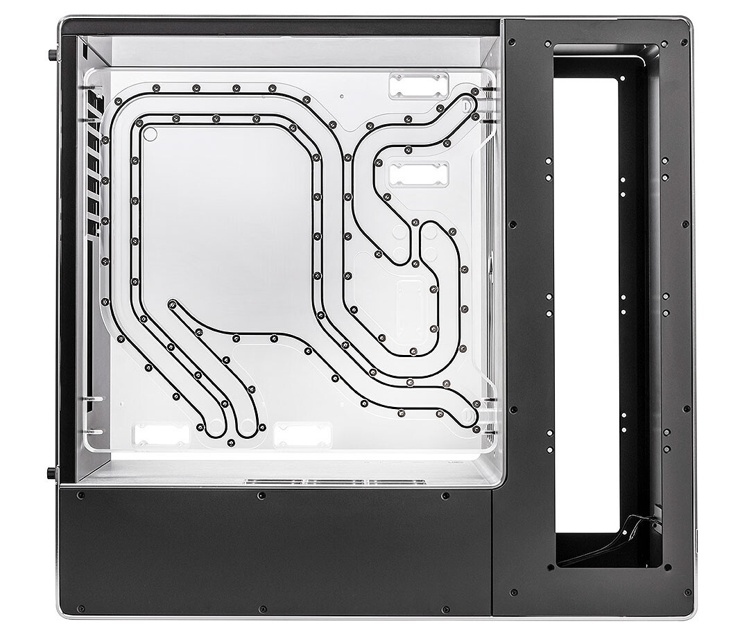 قاعدة اللوحة الأم الفريدة من نوعها تعمل كخزان لسائل تبريد مع عدة فتحات لإدخال الكابلات من خلالها. إنه مقترن كذلك مع مداخل ومخارج G1/4 متعددة قياسية ليعرض تركيب سهل للأنابيب الصلبة. الكيس قادر على دعم مايصل إلى قطعتي ردياتير 480 XE (سماكة 60 مم)، كما يتميز باتساعه لتركيب مضخة D4 ثنائية ليدعم ما يصل إلى أربعة بطاقات رسومية.