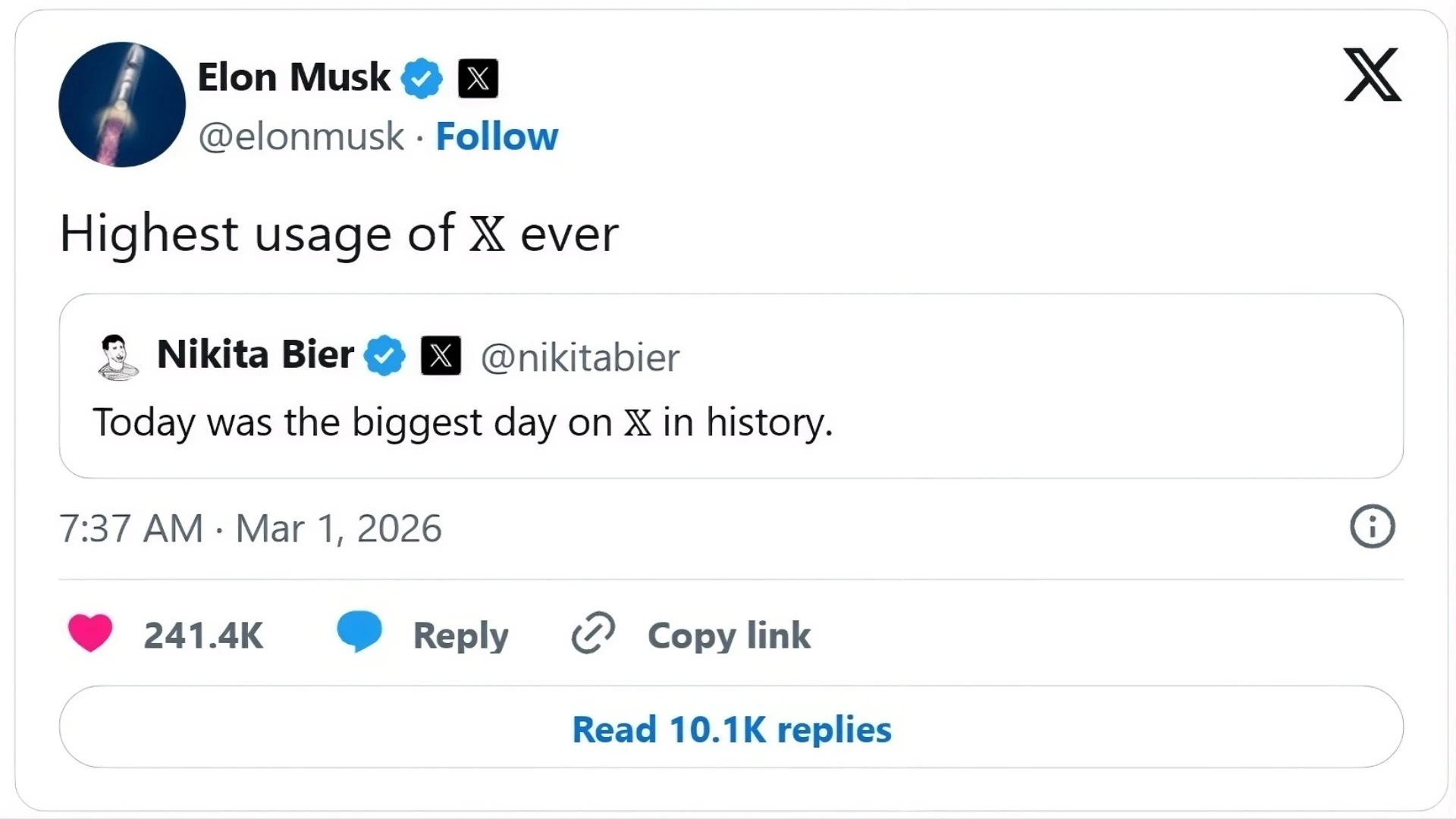 سجلت منصة X قفزة كبيرة في حركة التفاعل بعد الضربات الجوية التي شنتها الولايات المتحدة وإسرائيل على أهداف داخل إيران. تدفّقت لقطات الفيديو والتقارير الأولى على حسابات المُستخدمين ودفعت مئات الملايين إلى مُتابعة التطورات لحظة بلحظة عبر المنصة ممّا رفع معدل استخدام موقع X إلى مستويات قياسية.
