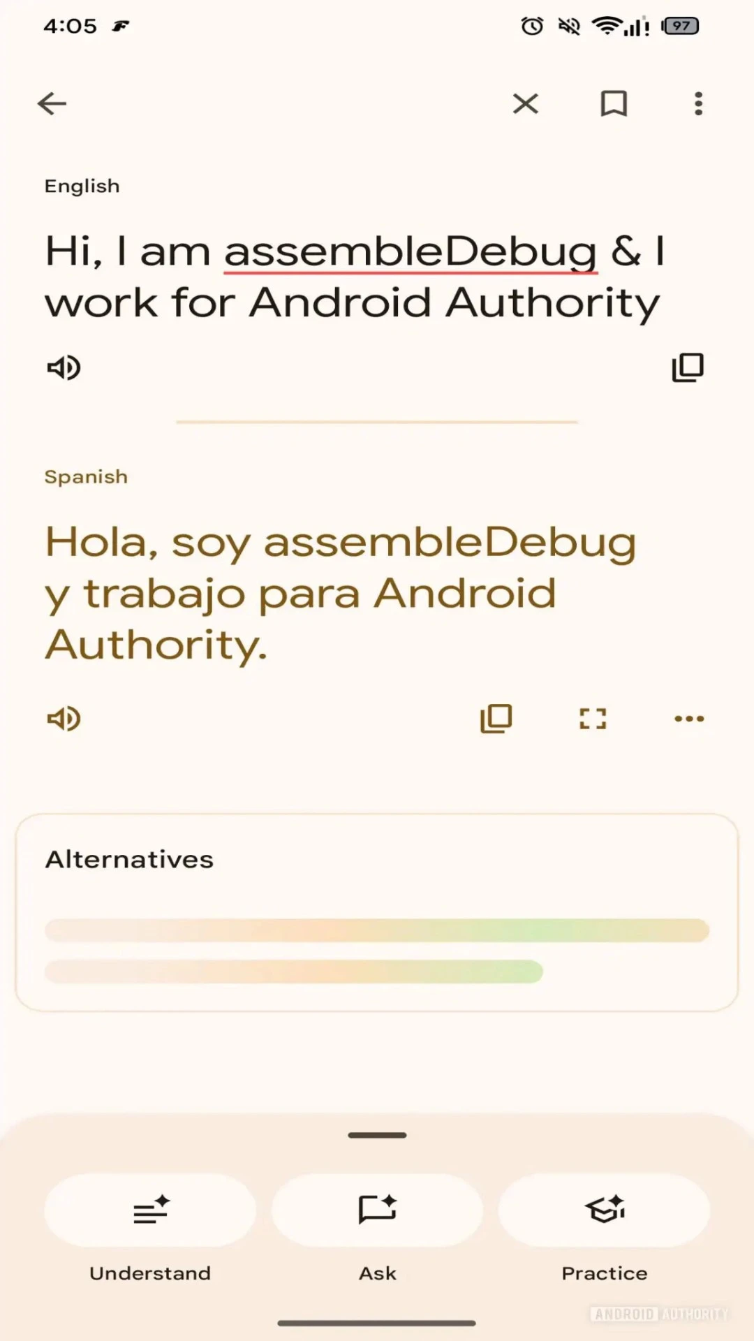 تعمل جوجل بصمت على تطوير وضع "Practice" الجديد الذي يُحلل نبرة صوتك، ويتيح التطبيق الاستماع للنطق الصحيح عبر متحدث آلي متطور ثم يطلب منك إعادة الكلمة بصوتك، ثمّ يلتقط الميكروفون ترددات صوتك ليخبرك التطبيق بمدى دقة نطقك مُقارنةً بالناطقين الأصليين.