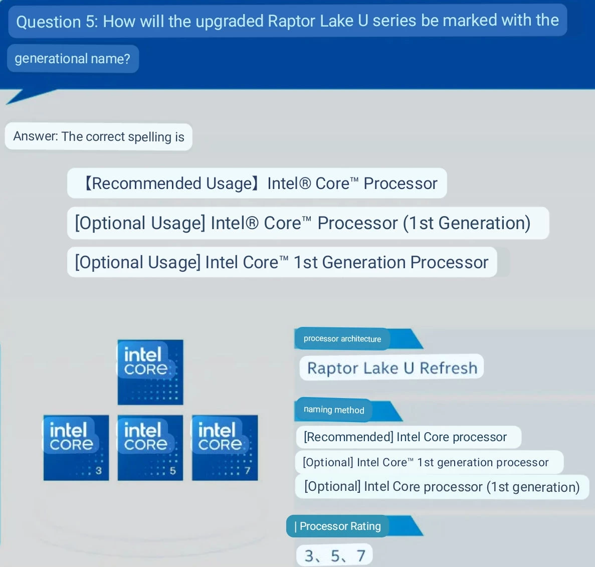 باختصار، ما تعنيه هذه المخططات هو أن العلامة التجارية Core # ستُنطبّق على معالجات Meteor Lake و Raptor Lake U Refresh، بينما سيتم استخدام مخطط التسمية Core i # القديم بواسطة معالجات Raptor Lake-S Refresh و Raptor Lake-HX Refresh.