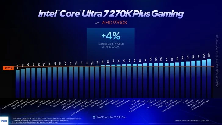 عند مقارنته (الـ Ultra 7 270K Plus) مع معالج AMD Ryzen 7 9700X، الذي يأتي بنفس السعر (299 دولارًا)، حقق معالج Intel تفوقًا متوسطًا بنسبة 4%، مع فارق يصل إلى 23% في بعض الحالات.