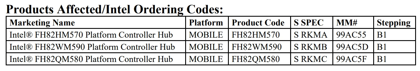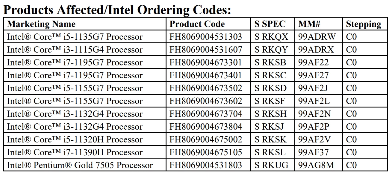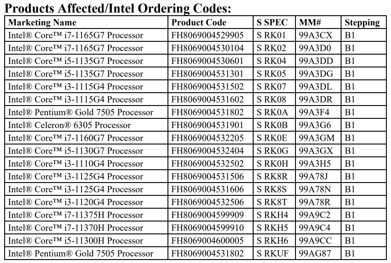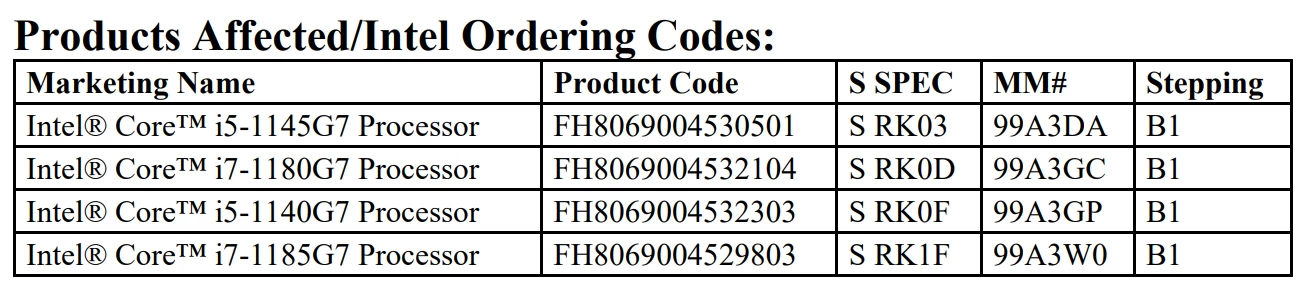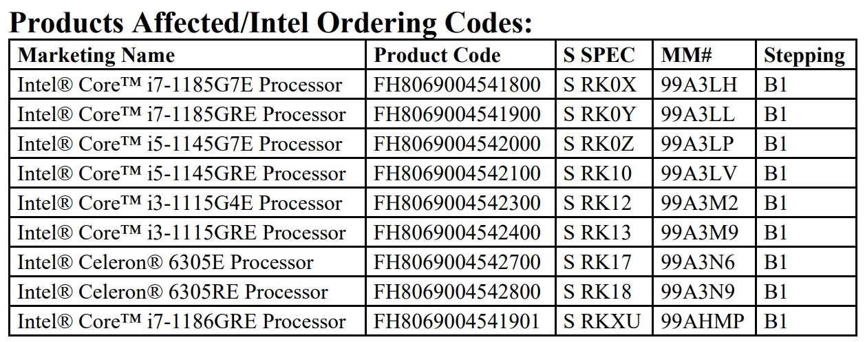 ستؤثر هذا القرار النسخ منخفضة الطاقة من المعالجات، أو ما يسمى بسلسلة U، بالإضافة إلى بعض رقائق Tiger Lake-H35 التي تضم ما يصل إلى أربعة أنوية. بالإضافة إلى ذلك، توقفت Intel أيضًا عن تصنيع مجموعات شرائحها لهذه المعالجات، وهي RM590E و HM570E و QM580E.