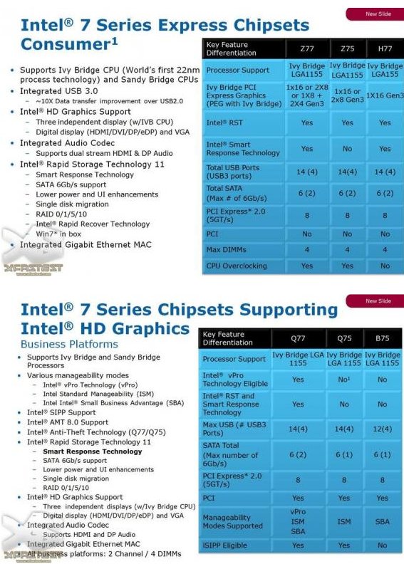 ومع ظهور تسريبات وصور من انتل للشركاء تبين أن انتل تخطط لتقديم الرقاقات الجديدة من الجيل السابع باسم Z77,Z75 و H77 للمستهلكين و Q77,Q75 و B77 لأجهزة الأعمال وستقدم هذه الرقاقات وللمرة الأولى دعماً لمنافذ USB 3.0 (اللوحات الحالية داعمة للـ USB 3.0 ولكن بشرائح أخرى والآن أصبح الدعم موجوداً من الرقاقات نفسها)