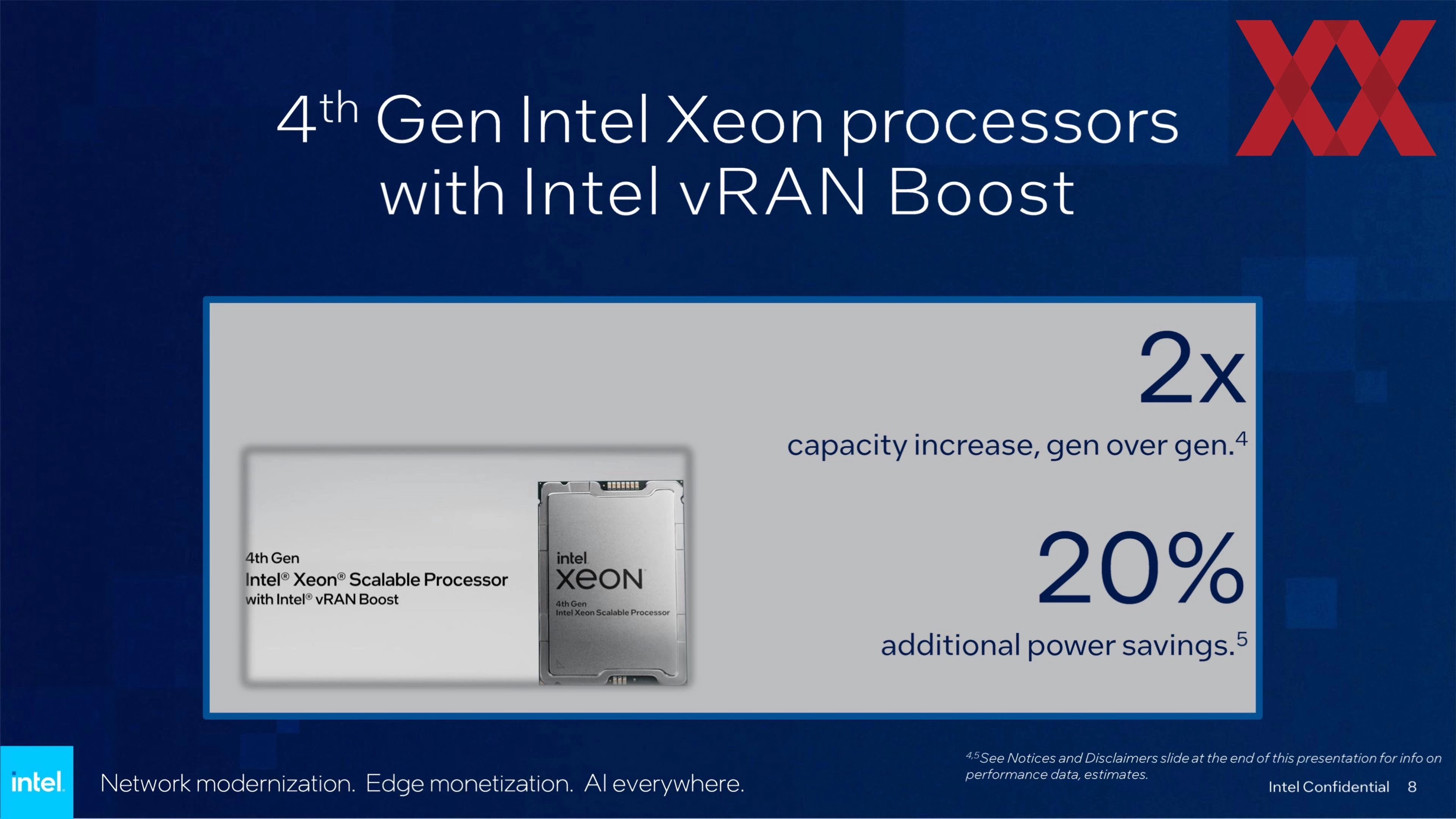 أما بالنسبة لشبكات الراديو vRAN، فإن Intel تقول أن منتجاتها الجديدة من سلسلتي Sierra Forest و Granite Rapdis-D يمكنهم توفير الطاقة بنسبة 20% وزيادة السعة بمقدار الضعف أيضاً بفضل تقنية vRAN Boost.
