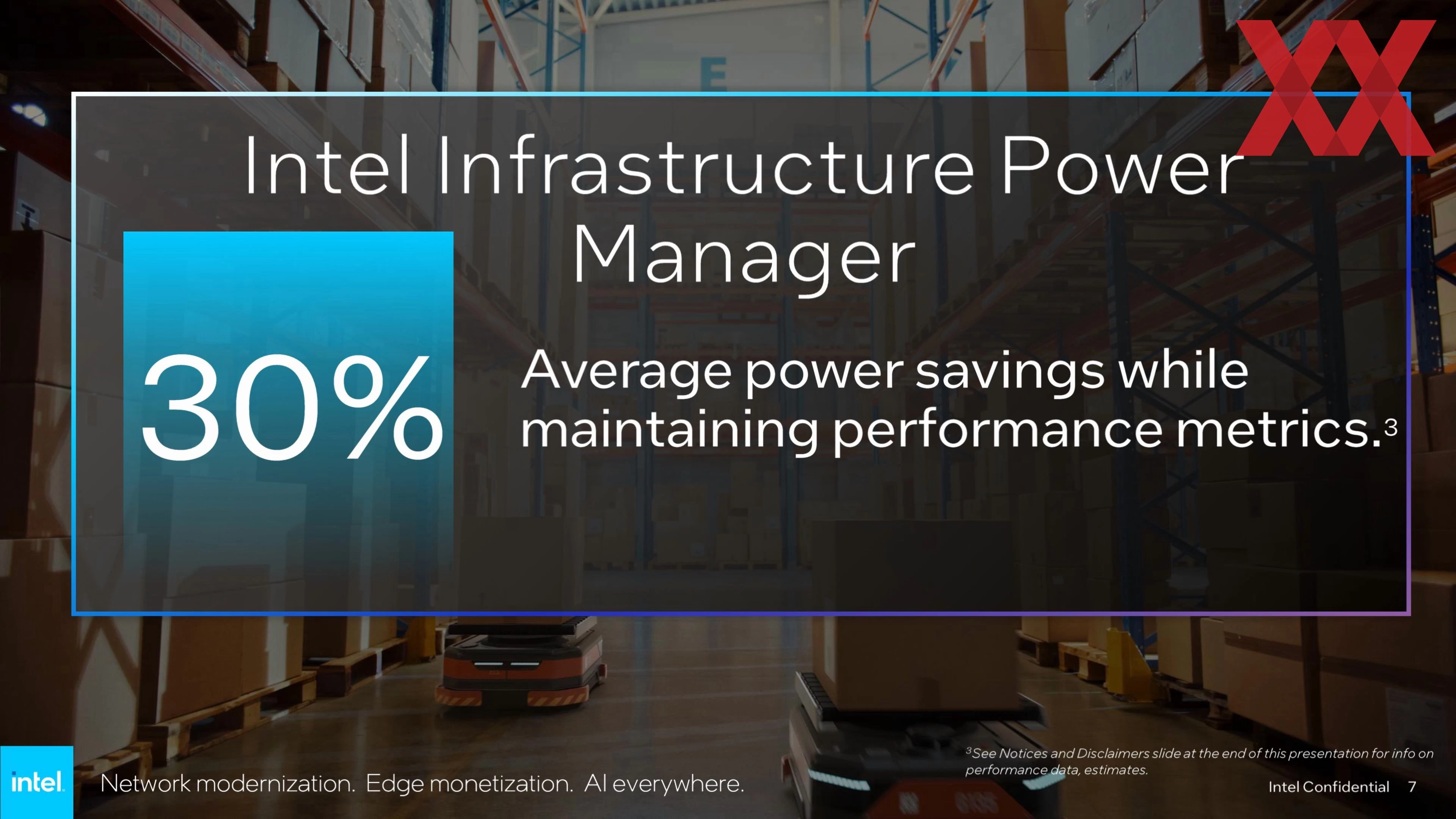 الجدير بالذكر أيضاً أن هذا الجيل القادم من معالجات Xeon سيكون متاح مع برنامج Intel Infrastructure Power Manger (IPM) المصمم لشبكات الجيل الخامس، مما سيوفر كفاءة أكبر للطاقة مع هذه الخوادم. وتدّعي إنتل أن هذه المنتجات ستستهلك طاقة أقل بنسبة 30%، الأمر الذي سيؤدّي بالتالي إلى تقليل البصمة الكربونية وخفض التكلفة الإجمالية، واتّساع رقعة انتشار الشبكات الجديدة.