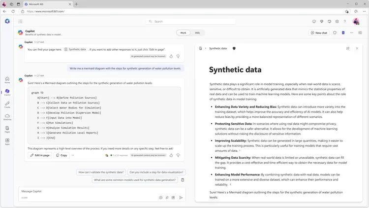 كوبايلوت Pages هي طريقة جديدة لدمج كوبايلوت في مسار العمل، ببساطة تعمل كوبايلوت Pages على جلب الردود التي حصلت عليها من كوبايلوت ودمجها في مستند يمكن لجميع أعضاء الفريق التعديل عليه، وإضافة لذلك، كوبايلوت يقدم إجابات بناءًا على المعلومات الموجودة في تطبيقات مايكروسوفت 365 الأخرى عبر تبيويب Work، على سبيل المثال، يمكنك سؤال كوبايلوت عن معلومة داخل ملف وورد معين، أو أن تطلب منه إنشاء ملف مشابه مع تغيير بعض المعلومات التي تحددها، ومن ثم يدمج هذا الملف الجديد داخل كوبايلوت Pages بحيث يمكن لجميع أعضاء الفريق التعديل عليه.