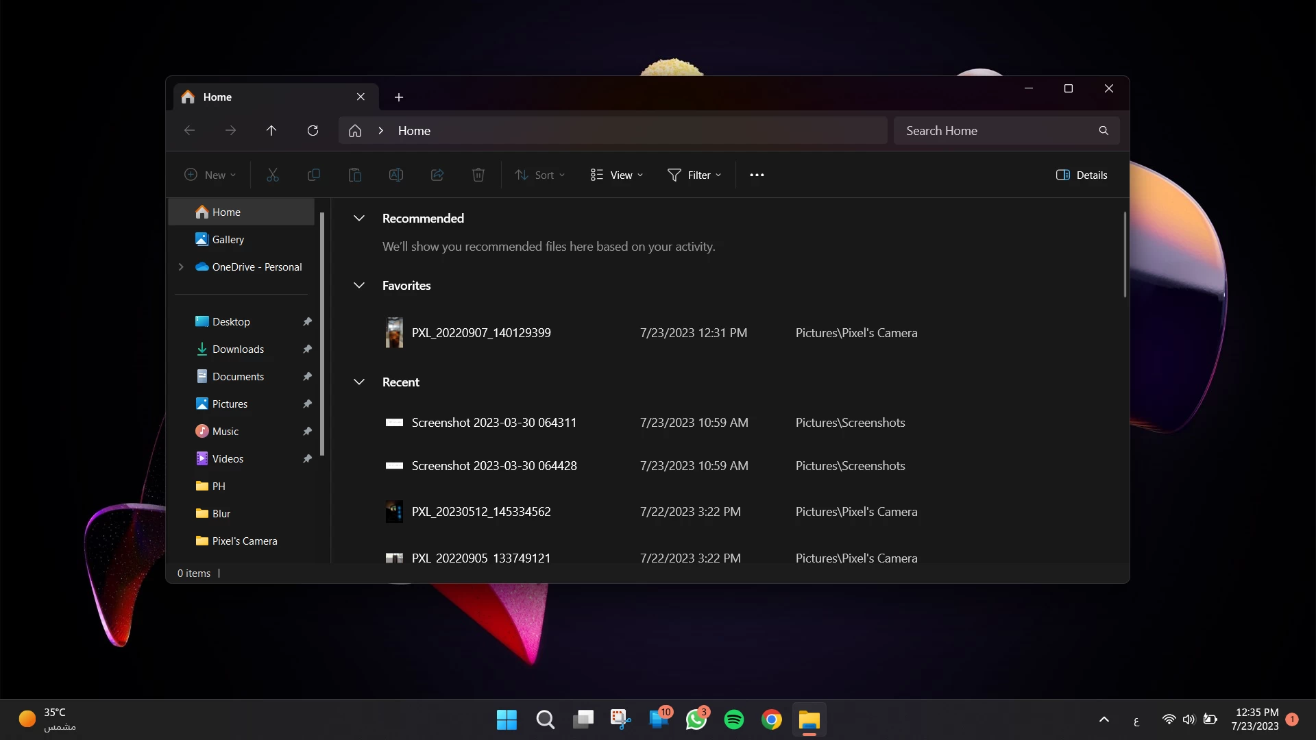 أعادت مايكروسوفت تصميم القسم الرئيسي «Home» في متصفح الملفات، ستلاحظ أن القائمة المعروض فيها الملفات أصبحت مُحدثة. كذلك أُضيفت نافذة جديدة تُظهر عدد من الملفات المقترحة بناءً على استخدامك؛ ولكنها تَعمل فقط عند تسجيل الدخول إلى ويندوز باستخدام حساب «Azure Active Directory» لسببٍ ما. أعادت مايكروسوفت تسمية مجلد الصور إلى «Gallery»، وحوّلت الواجهة داخله إلى ما يُشبه معرض الصور.