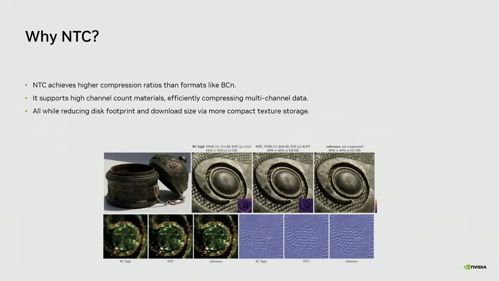 تقنية جديدة عرضتها NVIDIA قد تغيّر طريقة استهلاك الألعاب للذاكرة بشكل كبير خلال السنوات القادمة، واسمها Neural Texture Compression أو اختصارًا NTC. الفكرة ببساطة أن الشركة تريد تقليل استهلاك الـ VRAM بشكل ضخم دون تقليل جودة الرسوميات، أو استخدام نفس الذاكرة لرفع جودة الخامات بدلًا من تقليلها.