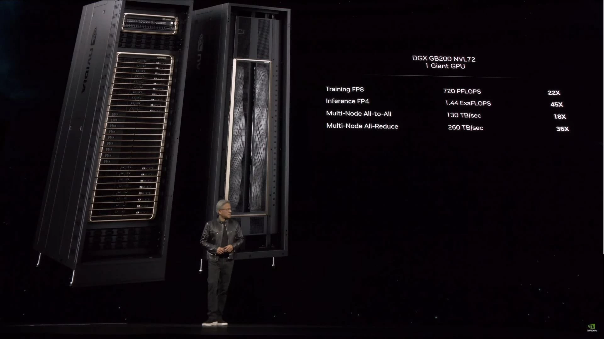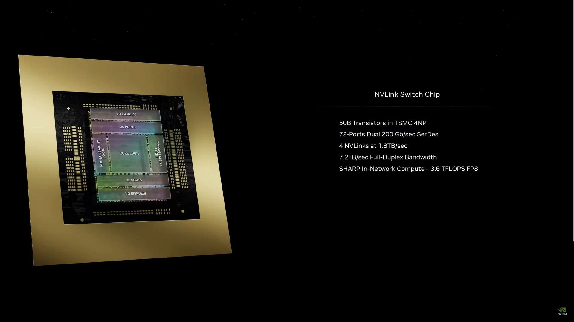 يتميز كل نظام DGX GB200 بـ 36 شريحة NVIDIA GB200 Superchips - والتي تتضمن 36 وحدة معالجة مركزية NVIDIA Grace و72 معالج رسومي من فئة NVIDIA Blackwell - متصلة كحاسوب عملاق واحد عبر الجيل الخامس من توصيلات NVIDIA NVLink البينية.